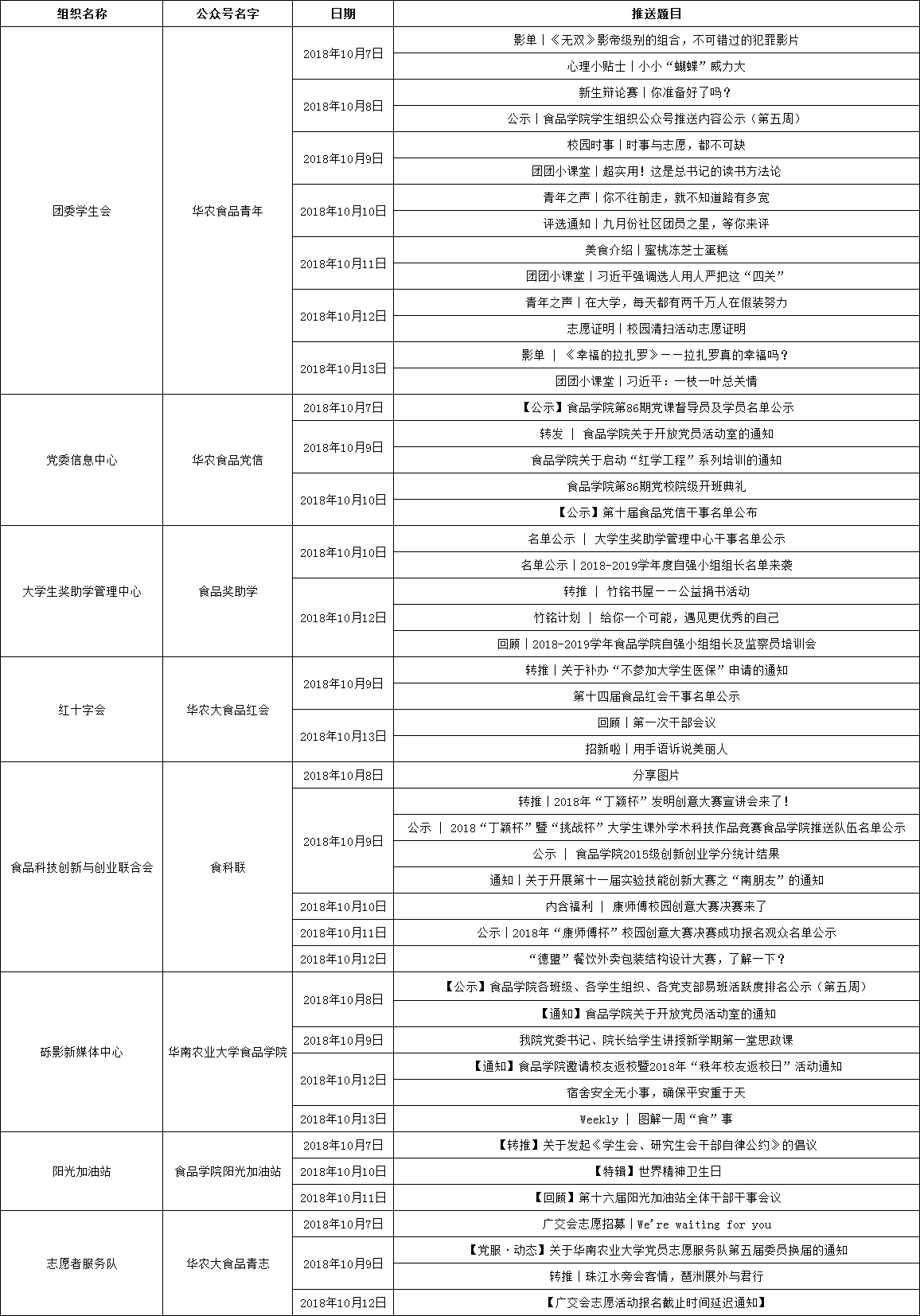 为认真落实学校共青团改革实施方案的要求,切实加强和改进我院共青团各项工作和建设,统筹推进上下联动。坚定不移推进共青团改革攻坚挺向纵深,全面加强从严治团,有效提升基层团组织的活力和战斗力,为使学院师生更加清楚地了解我院各学生组织每周的活动开展和宣传情况,现将我院各学生组织公众号的推文内容进行公示,公示如下: