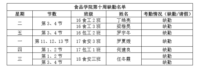 本周较多人缺勤,希望同学们养成良好的生活习惯,做到上课不缺席。祝同学们生活愉快!