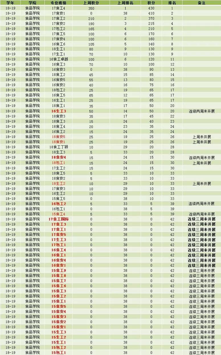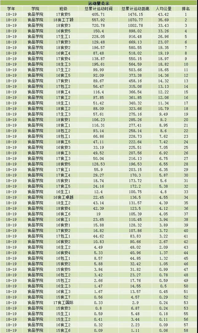 本周开展阳光体育的班级数为33,本周开展情况良好。院运会刚过,大家的积极性相较有一定提高,应该积极开展阳光体育运动,早日达到要求的积分。本周已是本学年第三次统计阳光体育情况,仍有很大一部分班级为开展过阳光体育活动。希望各位体委引以重视。另外,有些班级的积分存在刷分嫌疑,希望各位体委诚实上传,切勿作假,否则会影响到整个学院的积分情况。各位体委在开展时可以多开展几项运动,增加上传次数。本周阳光体育前三的班级是17食工4班、17食安1班、17食工2班,分数分别为430、410、370,值得各班级学习,但希望各位体委能诚实上传。另外,阳光体育食品学院积分暂时排名第二,运动量暂时排名第四。