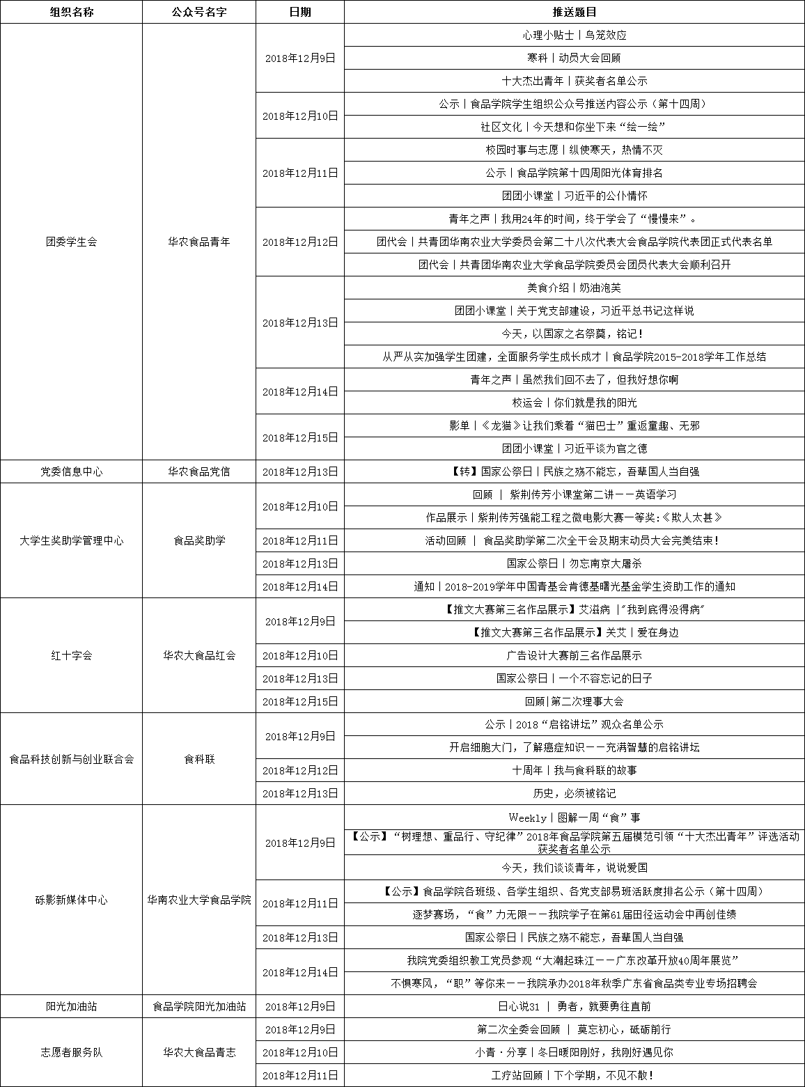 为认真落实学校共青团改革实施方案的要求,切实加强和改进我院共青团各项工作和建设,统筹推进上下联动。坚定不移推进共青团改革攻坚挺向纵深,全面加强从严治团,有效提升基层团组织的活力和战斗力,为使学院师生更加清楚地了解我院各学生组织每周的活动开展和宣传情况,现将我院各学生组织公众号的推文内容进行公示,公示如下: