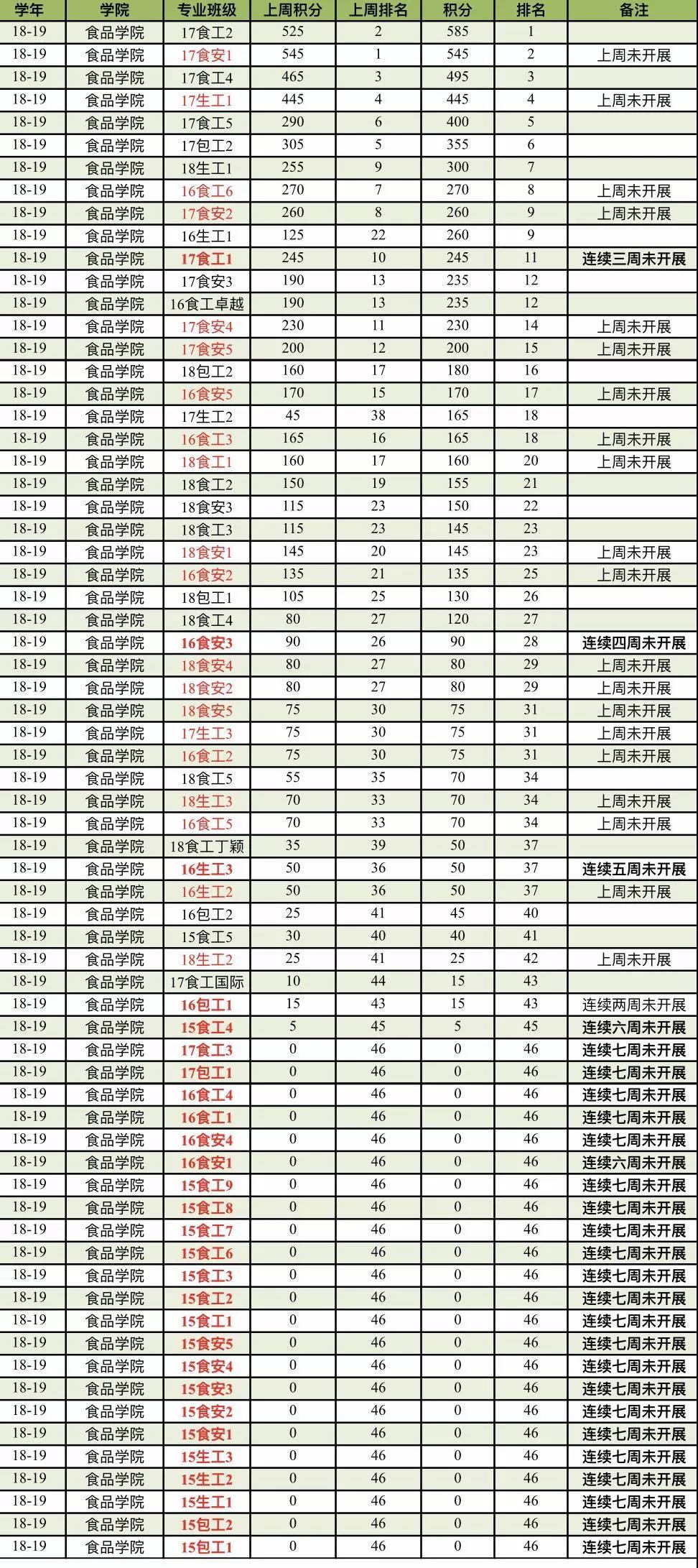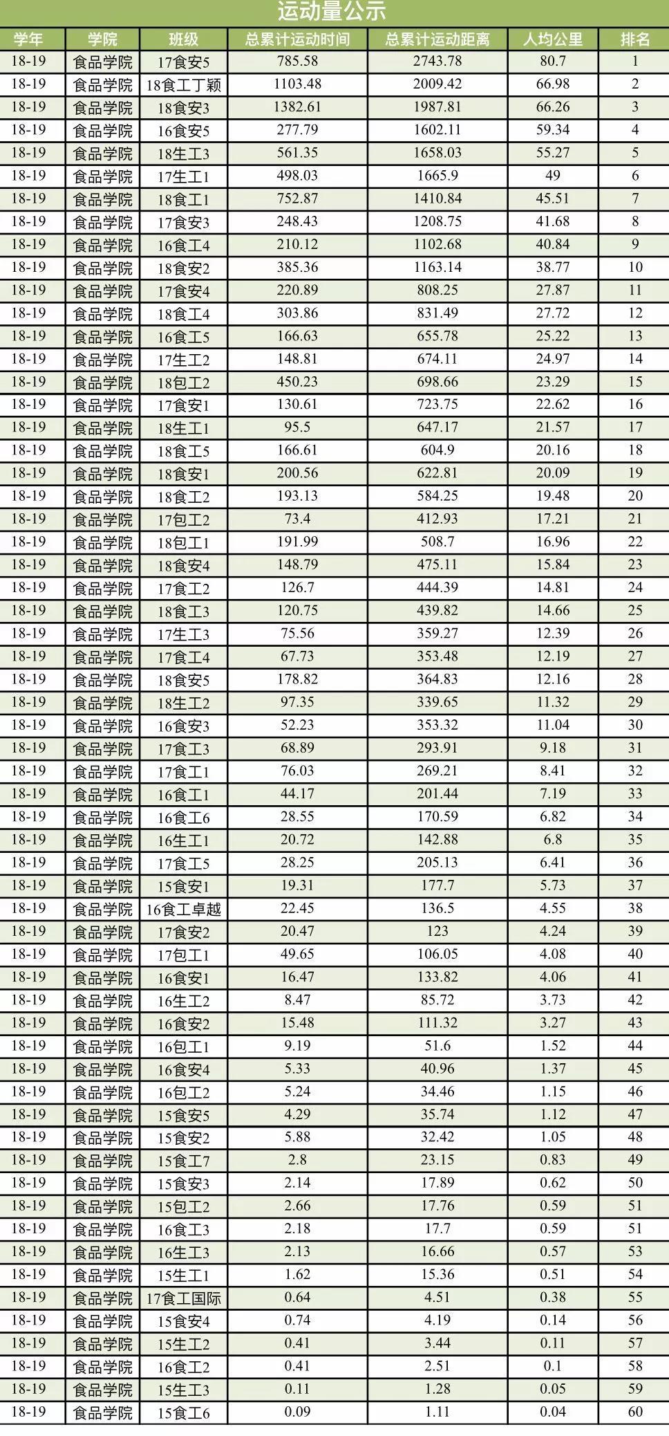 本周开展阳光体育的班级数为27,本周开展情况一般。目前,17级有一个班级、16级有四个班级未开展过阳光体育活动,事关学院荣誉,希望体委能引以重视。另外,各位体委在开展时可以多开展几项运动,增加上传次数。本周学院积分排名下滑严重,希望各位体委能引以重视,加强阳光体育活动。另外,也需要加强运动量的成绩提升。本周阳光体育前三的班级是17食工2班、17食安1班、17生工1班,分数分别为620、545、525,值得各班级学习。另外,阳光体育食品学院积分暂时排名第五,运动量暂时排名第三。 考试周期间将暂停统计公示阳光体育每周情况,本学期最终排名情况将在2019年1月6日晚23:00进行统计,希望各班不要松懈,多开展阳光体育,尽早追上排名靠前的学院,保持食品学院优良传统。