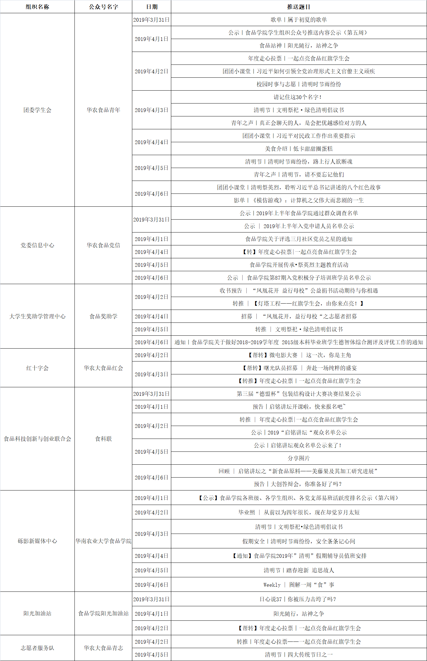 为认真落实学校共青团改革实施方案的要求,切实加强和改进我院共青团各项工作和建设,统筹推进上下联动。坚定不移推进共青团改革攻坚挺向纵深,全面加强从严治团,有效提升基层团组织的活力和战斗力,为使学院师生更加清楚地了解我院各学生组织每周的活动开展和宣传情况,现将我院各学生组织公众号的推文内容进行公示,公示如下: