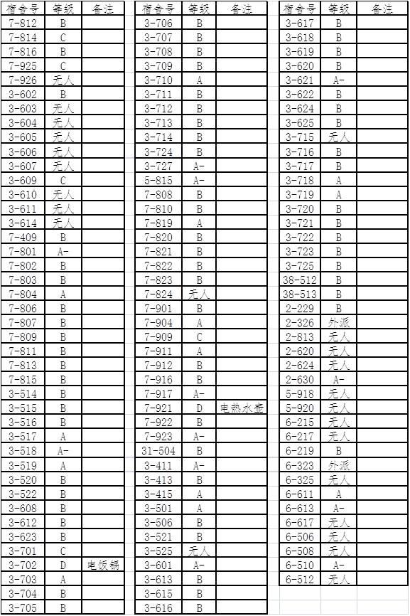 学院于2019年4月3日进行了4月的宿舍文明评比工作,现进行公示,研究生查寝打分方式,设A、B、C、D四个等级,A等为优秀,B等为合格,C等为基本合格,D等为不合格,并控制A等数量在10%。