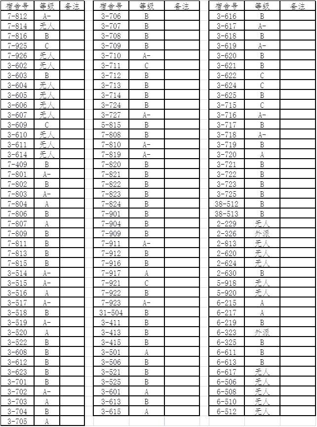学院于2019年4月28日进行了5月的宿舍文明评比工作,现进行公示,研究生查寝打分方式,设A、B、C、D四个等级,A等为优秀,B等为合格,C等为基本合格,D等为不合格,并控制A等数量在10%。