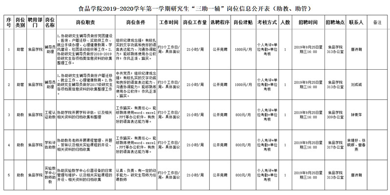 现将我院2018-2019第一学期研究生“三助一辅”岗位信息公布如下,请有意向的同学按岗位设置在9月25日14:30前将纸质版(附近1,附件2)材料交到院楼313室,将电子版(附件1)交到邮箱947760167@qq.com,学院将在9月25日前完成招聘。