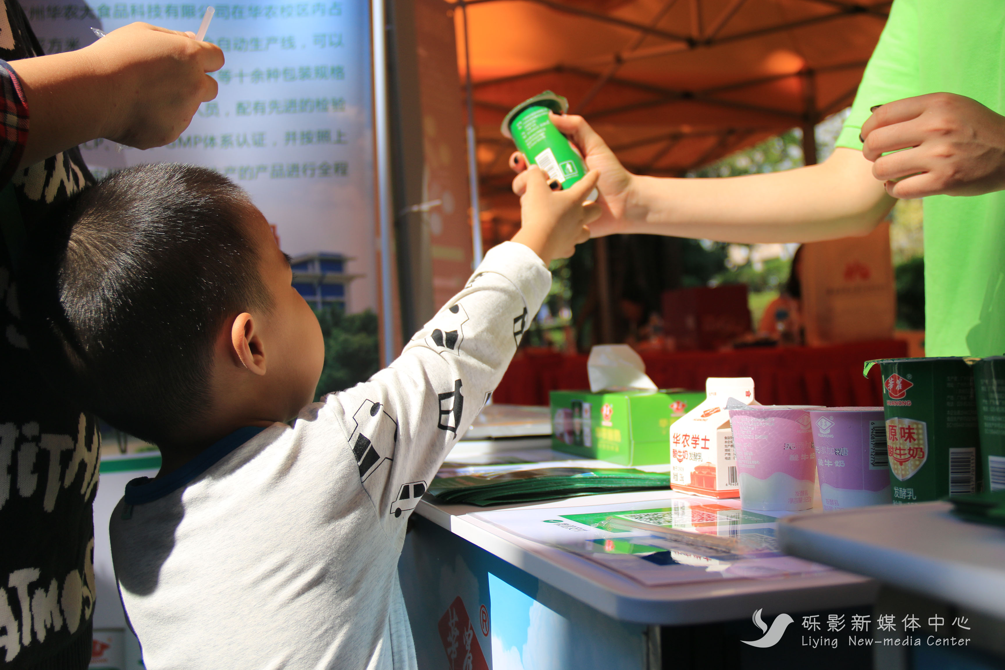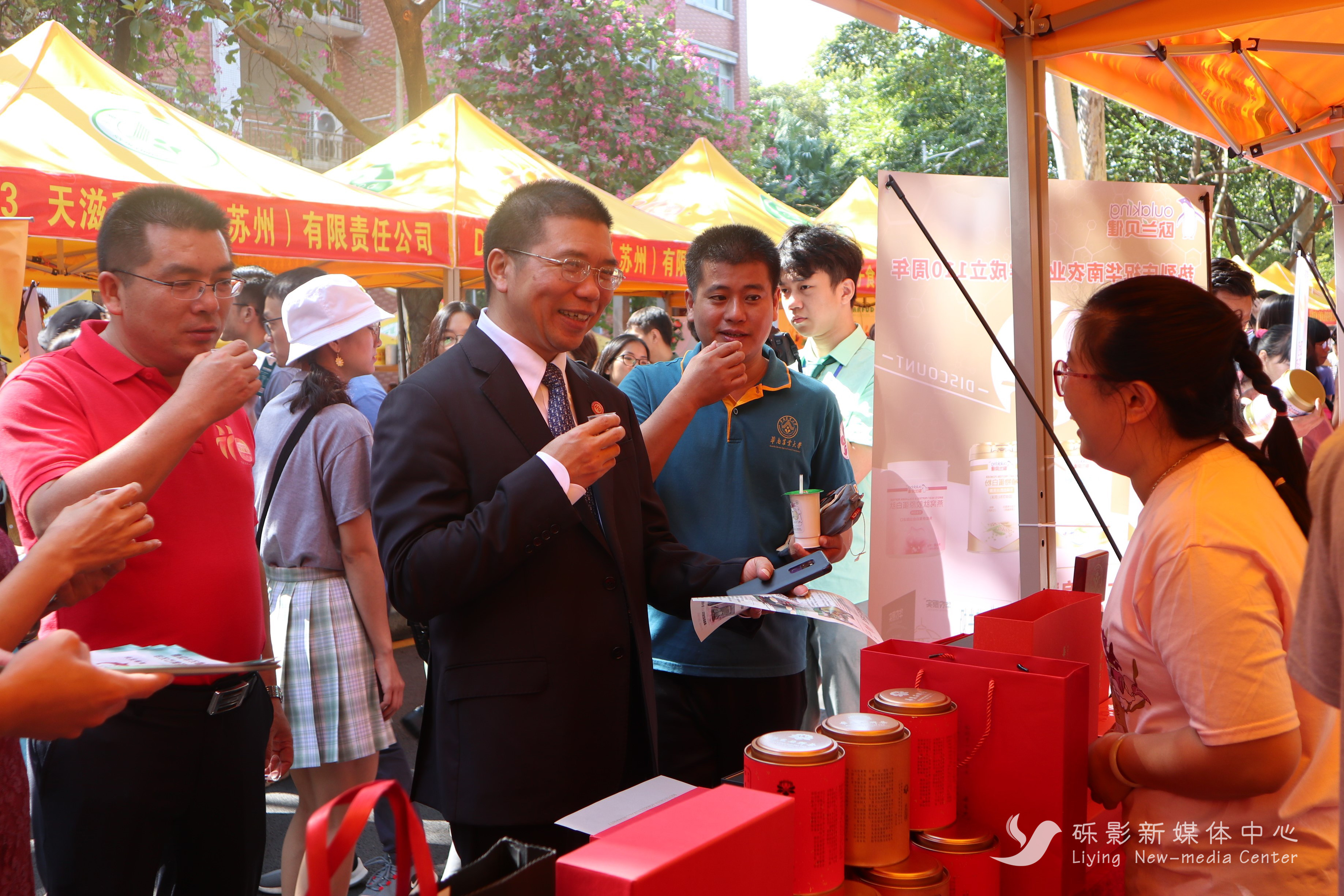展区设有试吃、试用等丰富的体验活动,吸引了众多校友和在校学子的驻足。其中有美味的绿稻人葛脆片、葛根粉、秋之风广式腊肉;有可口的华农酸奶、问山特调奶茶、爻牌普洱;还有好用的万颜护肤品、金钗石斛舒缓修复面膜等等。