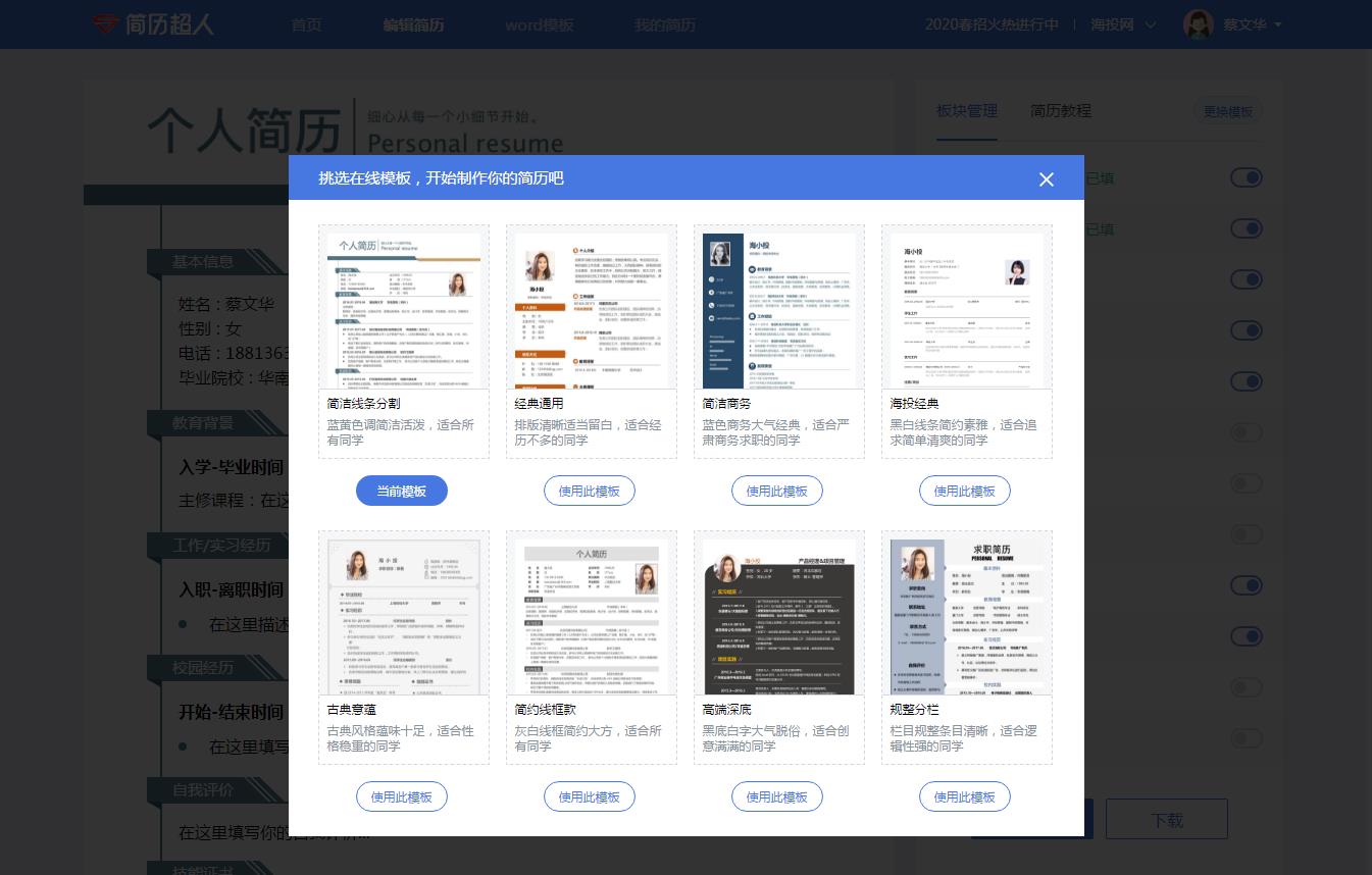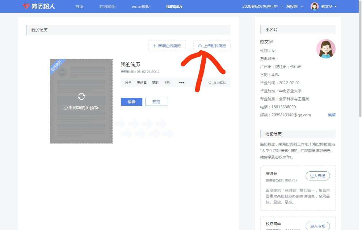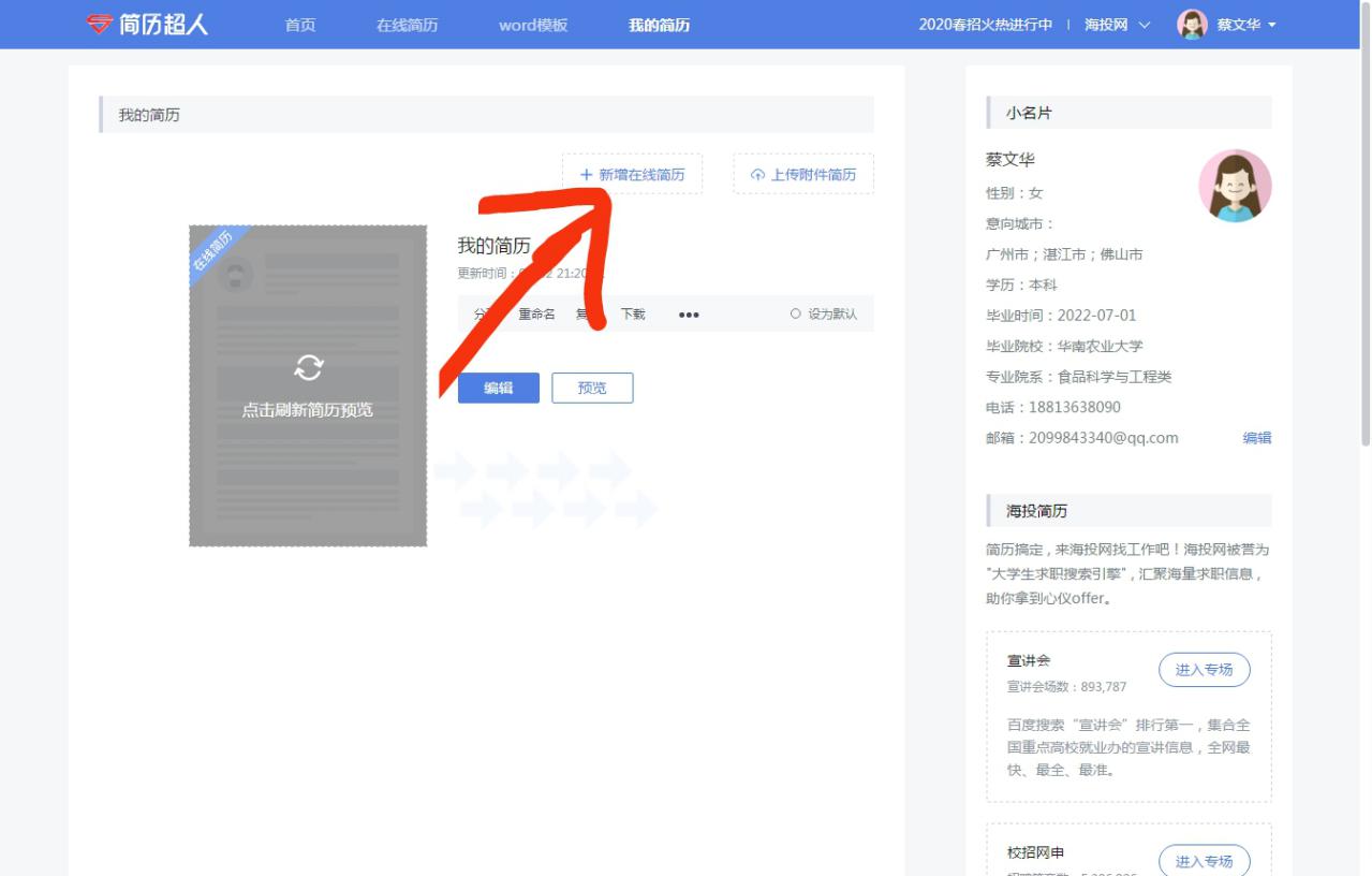 (2)完善简历。登录成功后,制作简历,点击最上侧【简历超人】或点击右侧【我的简历】进入简历制作专属界面。