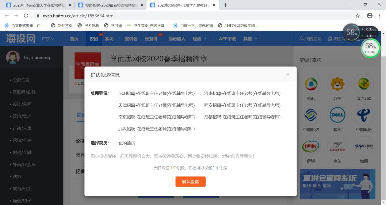 (3)简历投递。点击[校招],选择心仪企业招聘信息,投递简历。