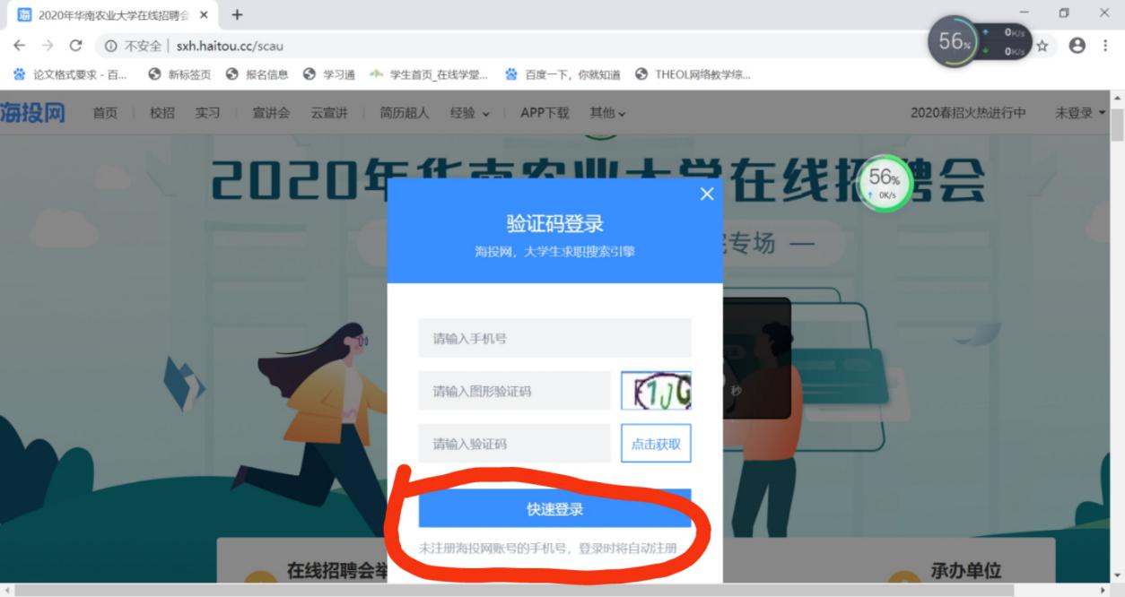 (1)注册登录。访问华南农业大学网站(http://sxh.haitou.cc/scau)点击右上角登录账号,支持电脑端网页版&手机端H5查阅,未注册用户,点击【快速登录】按钮注册新账号。
