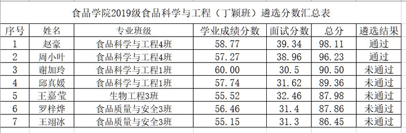 根据《华南农业大学丁颖创新班管理办法》(华南农办﹝2017﹞76号)《华南农业大学食品学院2019级本科生食品科学与工程(丁颖创新班)选拔方案》的文件精神,经学生个人申请、年级审核、学院专家小组面试,现将最终遴选结果公示如下: