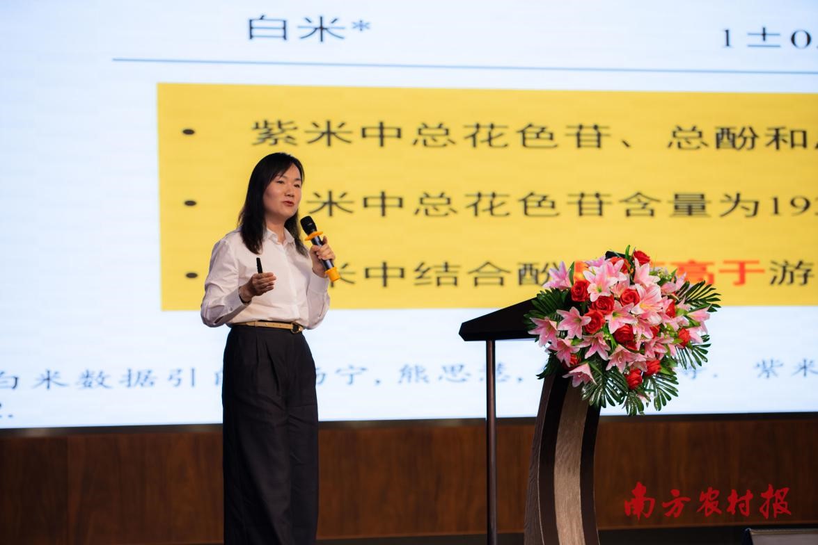 其中,针对丝苗米产业存在的品牌雷同、缺乏特色、同质化竞争严重等问题,黄苇教授提出了紫米深加工解决方案,并介绍了紫米花色苷、多酚黄酮类物质及其抗氧化活性。作为主食,紫米是花色苷的良好来源,具有潜在的抗衰老保健功效。这不仅与“禅宗文化”的养生理念相吻合,也极具市场推广前景。