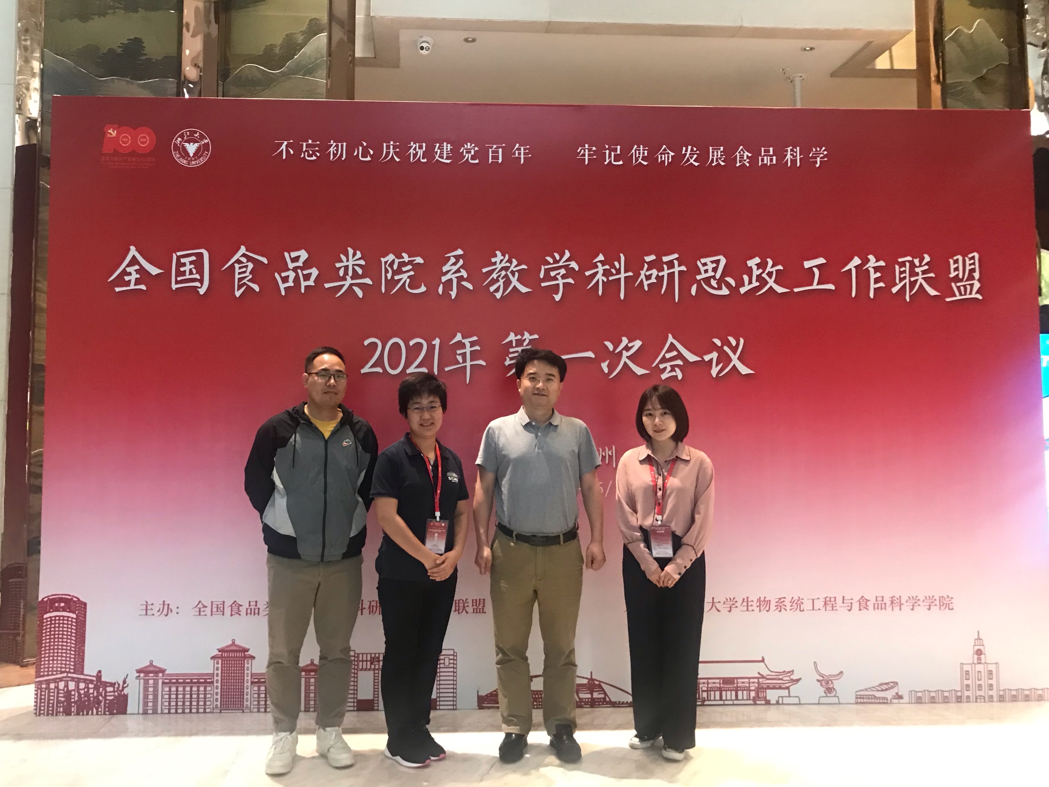 为深入学习贯彻习近平新时代中国特色社会主义思想和党中央关于在全党开展党史学习教育的重要部署,贯彻落实“为党育人,为国育才”的办学要求,隆重庆祝中国共产党成立100周年,2021年5月18日,全国食品类院系教学科研思政工作联盟2021年第一次会议在杭州召开。本次会议由全国食品类院系教学科研思政工作联盟主办,浙江大学生物系统工程与食品科学学院承办,以“不忘初心庆祝建党百年,牢记使命发展食品科学”为主题。应大会主办方邀请,我院雷红涛院长、陈晓梅副书记、刘丽葵副院长以及辅导员黄怀宇、余聪出席本次会议。