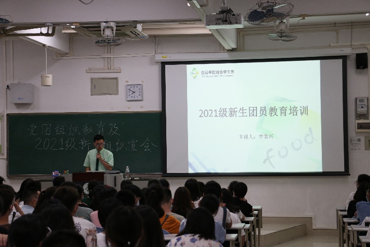 接下来,食品学院团委副书记覃常兴为新生讲解了共青团的定义和团支部的基本架构,解析了“三会两制一课”的具体工作要求以及团员的权利与义务,期望新生们严格要求自我,用行动践行对共青团的誓言。紧接着,覃常兴讲解了团旗团徽的标准,并希望新生们牢记党团知识。