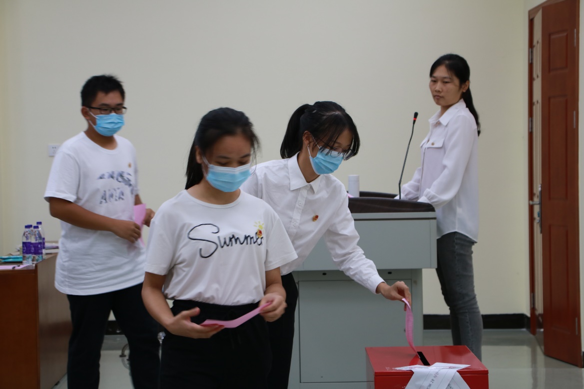 会议第五、六项为选举第二十八届学生会常设机构委员和主席团成员,会议代表们慎重选择,并有序将票投入投票箱。计票员计票后,总监票人王曾惠老师宣布选举结果。