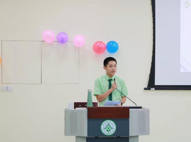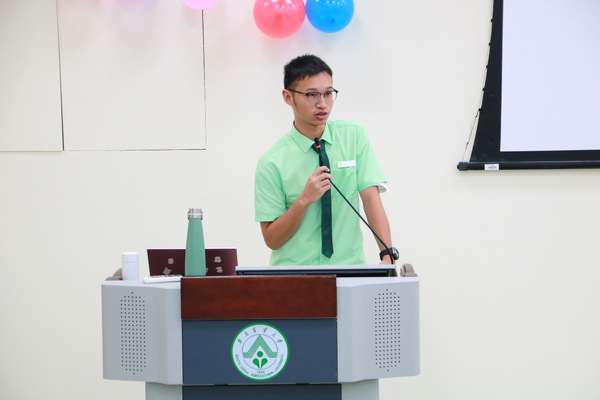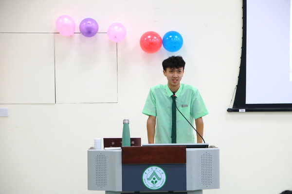 第二十八届学生会主席团成员梁泓波发言。他希望同学们端正态度,以人人平等的态度对待工作,并指出身体是革命的本钱,身体健康很重要,鼓励大家劳逸结合。