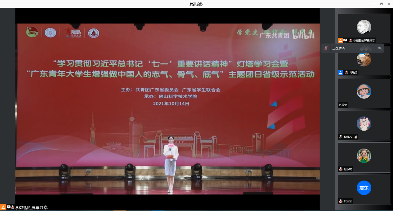 为进一步学习贯彻习近平总书记“七一”重要讲话精神,深入推进“灯塔工程——广东青少年学习践行习近平新时代中国特色社会主义思想行动”,积极引导广大团员青年增强做中国人的志气、骨气、底气。2021年11月4日19:00食品学院2020-2021期青马班、学“习”社全体成员应学校号召参加“学习贯彻习近平总书记‘七一’重要讲话精神”灯塔学习会暨“广东青年大学生增强做中国人的志气、骨气、底气”主题团日省级示范活动的学习。