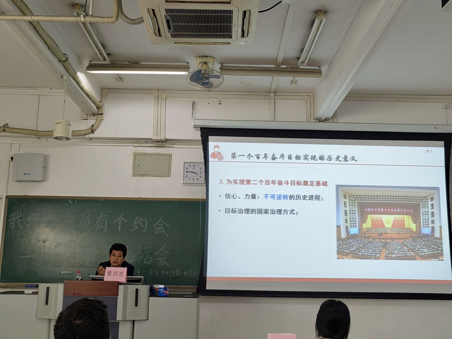为深入学习习近平总书记在庆祝中国共产党成立100周年大会上的讲话精神,引导学生支部党员进一步坚定理想信念,强化初心使命,发扬斗争精神,凝聚奋进力量,11月9日下午, 我院党委书记魏剑波在教五B栋404为食品质量与安全本科生第一党支部党员作百年讲话学习辅导。
