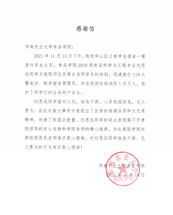 刘思远同学在火灾面前,临危不惧,表现冷静,有着崇高的道德品质,传递了校园正能量,展现了食品学子在灾难面前的勇气与担当!我校兽医学院特发来感谢信,高度赞扬了刘同学的壮举!