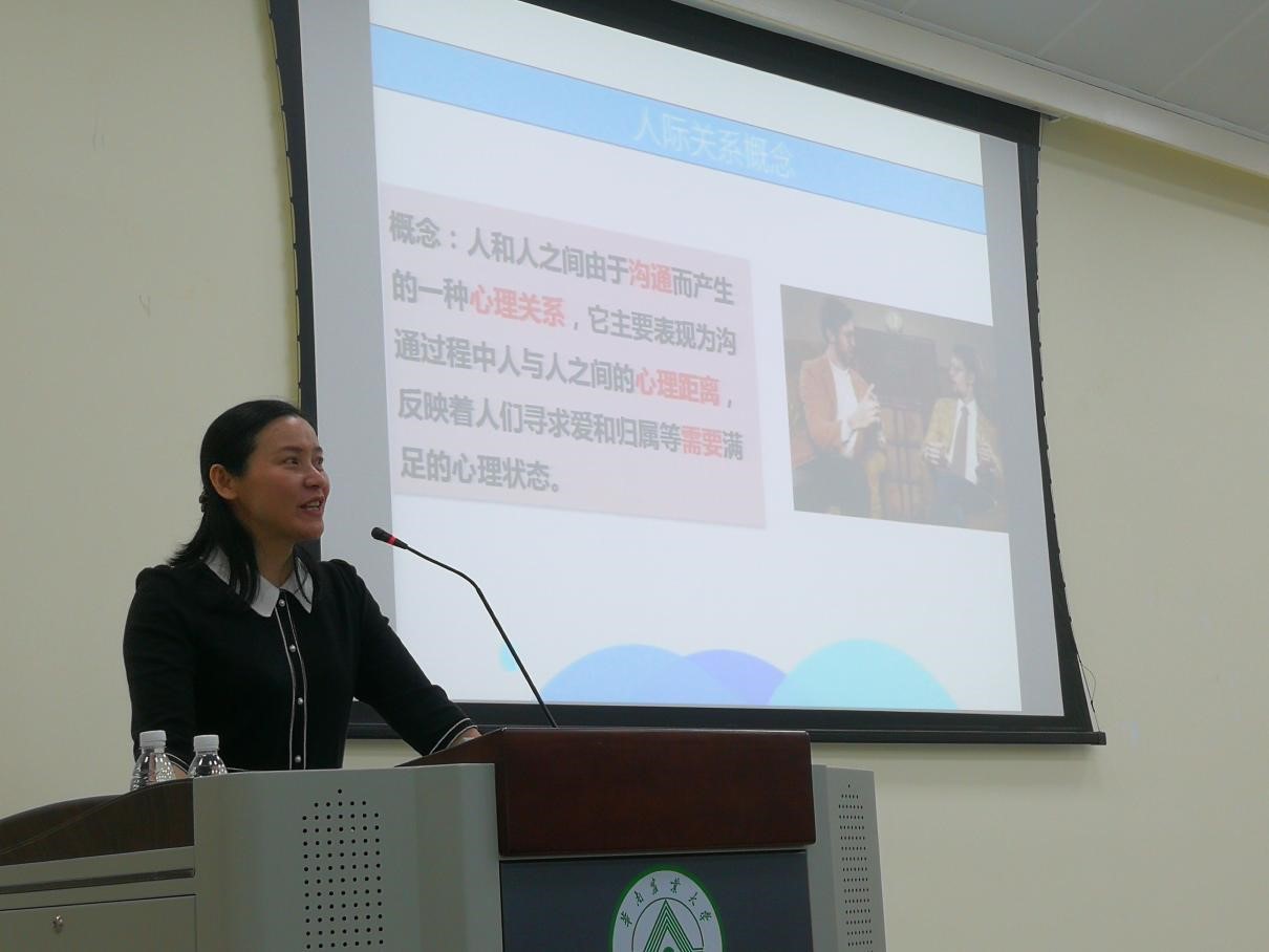 刘桂娥老师以一则“天堂与地狱”寓言故事引入本次讲座的主题,介绍了人际关系的概念和人际交往的心理效应,从其中首因效应、近因效应、刻板效应、投射效应、光环效应等5种影响人际交往的心理效应展开论述,阐述了研究生人际交往的特点,影响研究生人际交往的因素,并结合咨询经历和个人生活体验对研究生人际交往提出了一些建议。她强调研究生要以真诚态度去处理生活中的人际交往问题,灵活运用“真话不全说,假话全不说”。