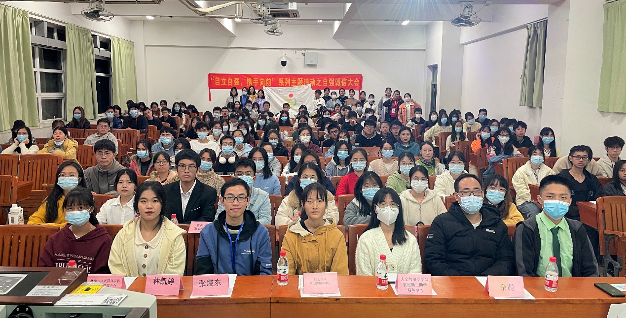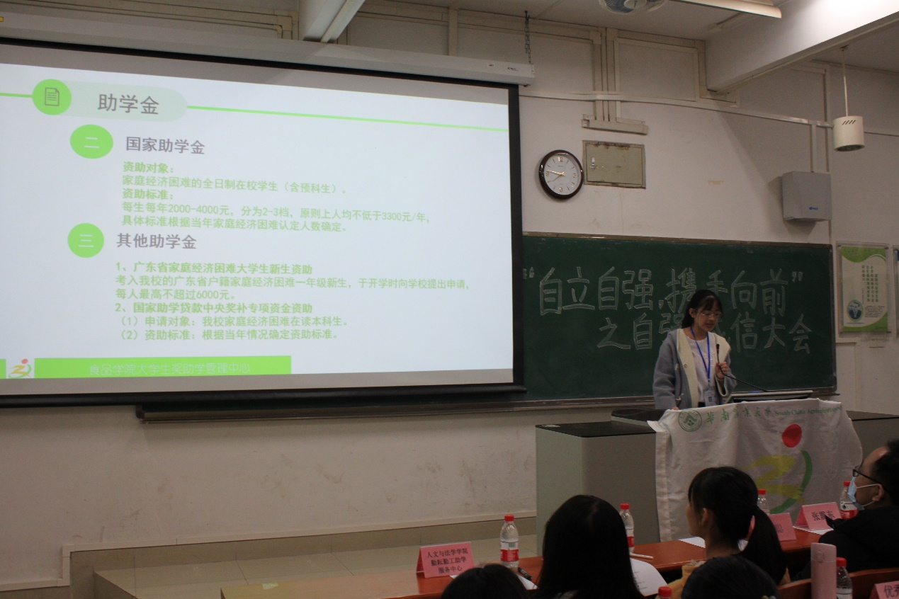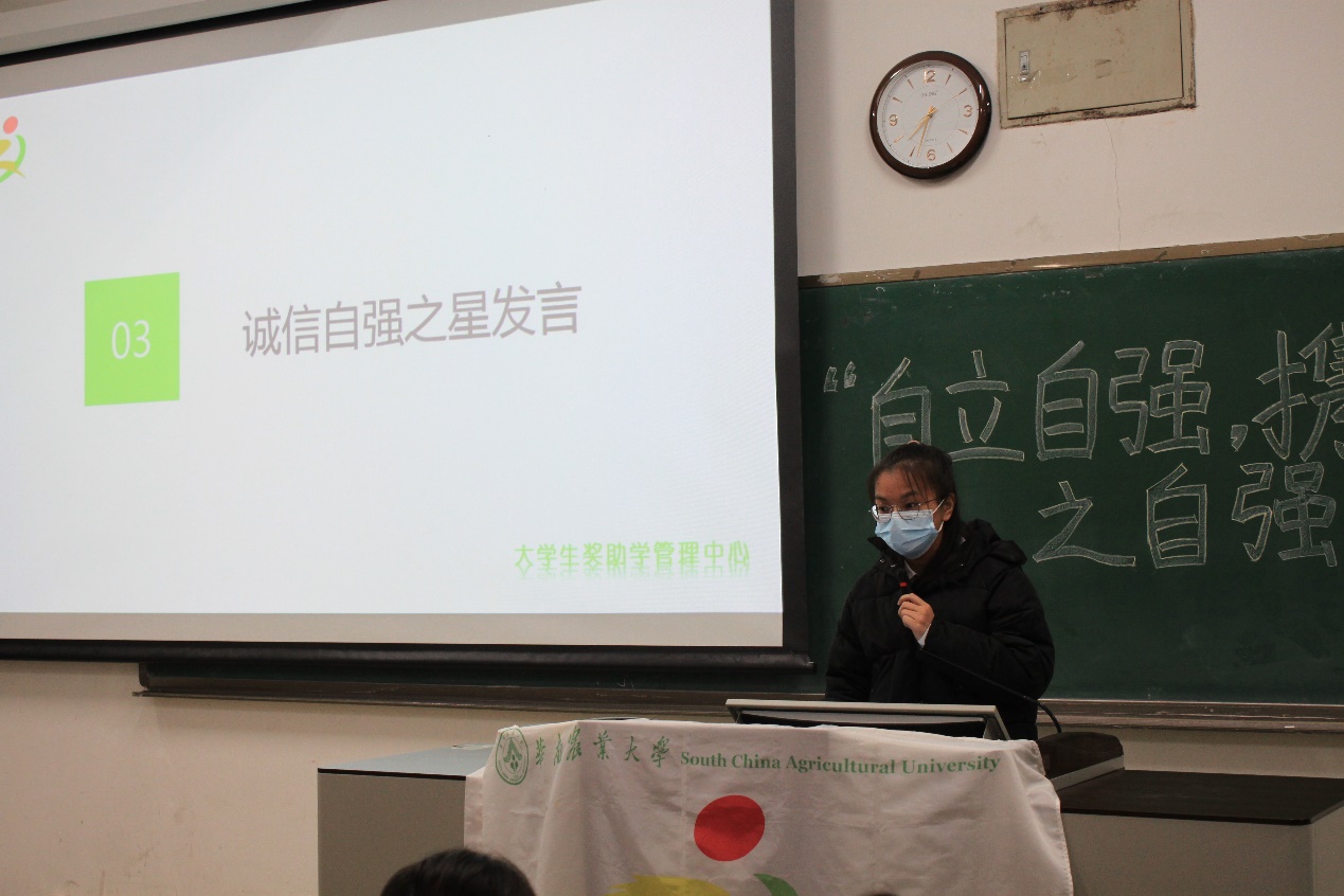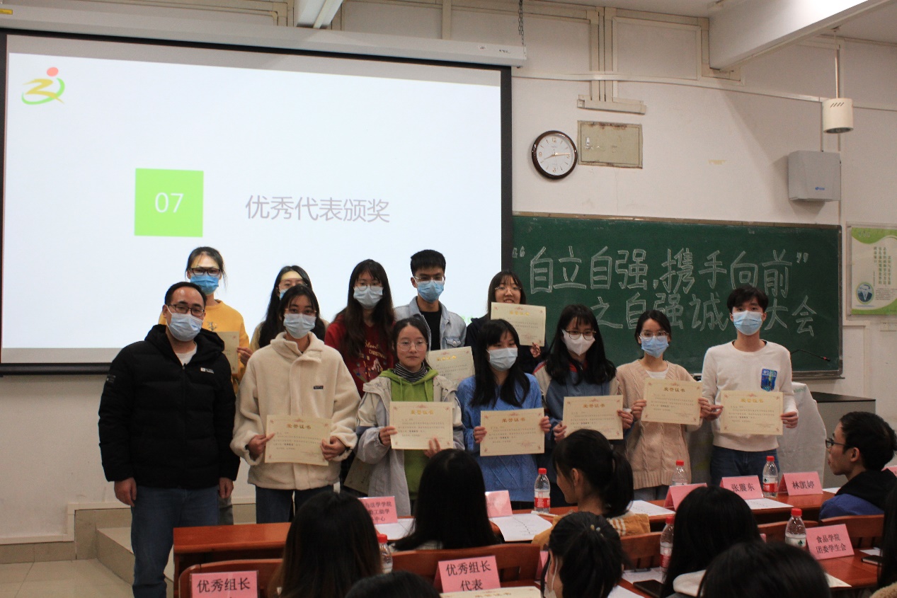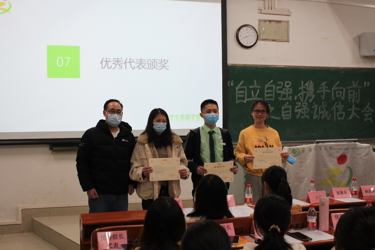 为进一步做好我院资助育人工作,加强自强小组同学自立、自强、诚信、感恩教育,12月4日晚上,我院大学生奖助学管理中心(以下简称“奖助学”)于第五教学楼C栋202举办2021-2022年度“自立自强,携手向前”系列主题活动之自强诚信大会。奖助学指导老师余聪、诚信自强之星林凯婷、自强小组全体成员、食品学院团委学生会代表、园艺学院、艺术学院、人文与法学学院、林学与风景园林学院代表,优秀小组、优秀组长、组员、优秀监察员代表及奖助学全体成员出席了本次会议。