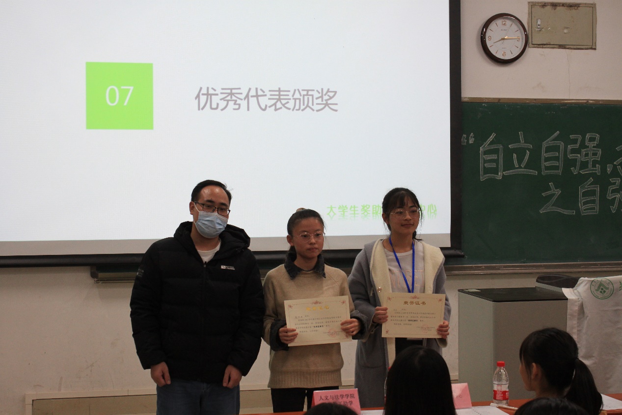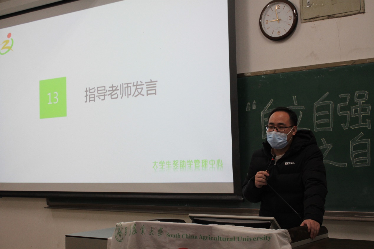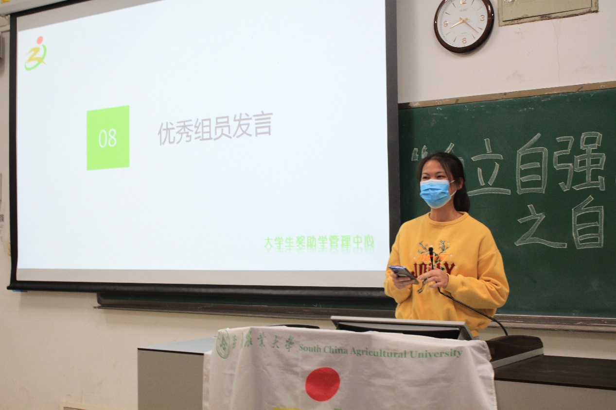 最后,指导老师余聪在发言中阐明了自强小组的组建是希望大家团结向前,共同发展,同时也鼓励自强小组全体成员磨砺自立自强的品格,茁壮成长,并倡导感恩资助,回馈社会。