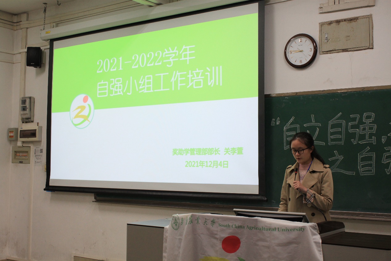 奖助贷项目部陈华、黄椿桦,紫荆传芳管理部关李萱分别进行了国家助学政策和诚信还贷培训、金融知识分享、自强小组相关工作培训。