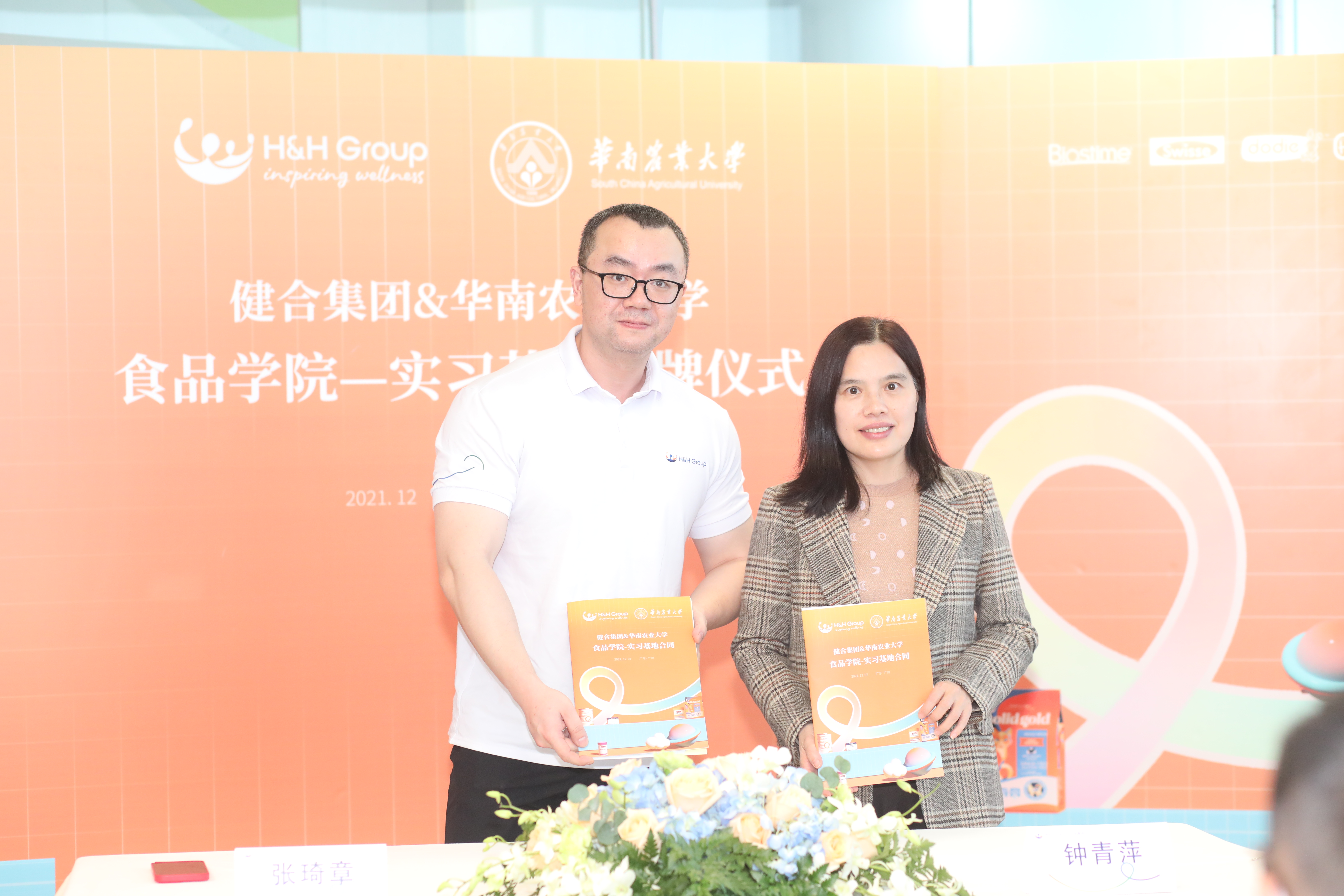 钟青萍副院长和张琦章代表双方签署了实践实习基地合作协议。伴随着热烈的掌声,双方领导为实践教学基地揭牌,并合影留念。实践教学基地的建立,标志着华南农业大学食品学院与健合集团的战略合作关系向着更深层次的方向推进。