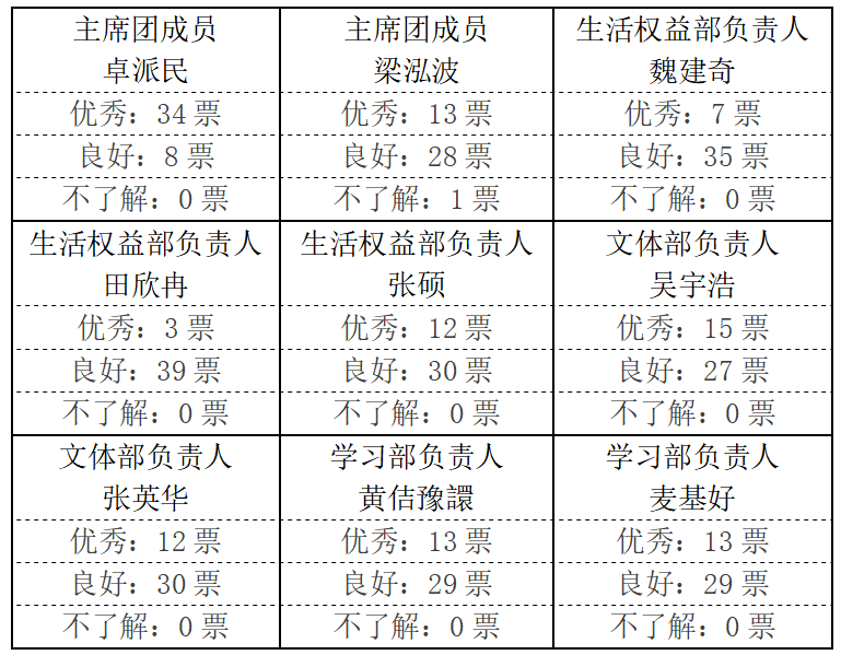 随后,42名评议小组成员对述职的学生会工作人员进行评议,评议结果如下: