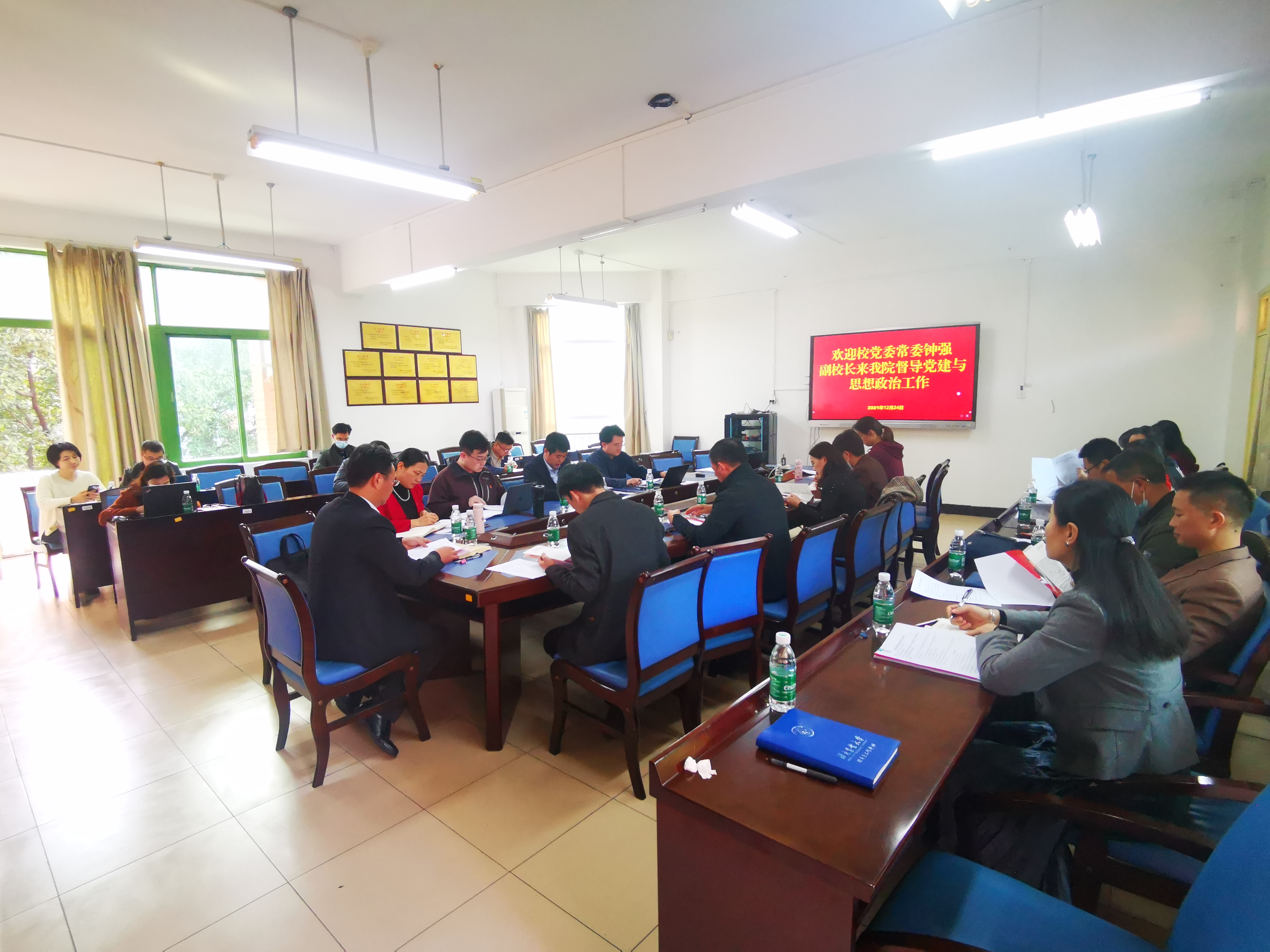 为深入推进党的十九届六中全会精神学习宣传贯彻,进一步巩固基层党组织标准化建设成果,持续发挥好基层党组织作用,12月24日下午,校党委常委、副校长钟强到我院督导党建与思想政治工作,会议由学院党委书记魏剑波主持。