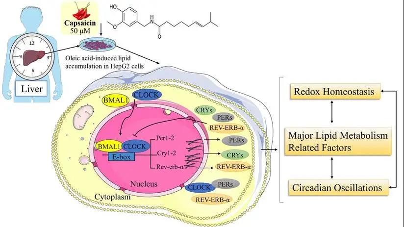 植物化学物质可以通过昼夜节律相关机制调节代谢紊乱,辣椒素(Capsaicin, CAP)是红辣椒中的主要辛辣成分,具有抗肥胖、抗炎、抗氧化、抗癌和抑菌等多种有益作用。基于该团队之前的工作发现,CAP可以通过生物钟基因的参与来缓解葡萄糖代谢紊乱。然而,CAP是否可以通过生物钟基因的参与调节脂质代谢紊乱,目前尚不清楚。