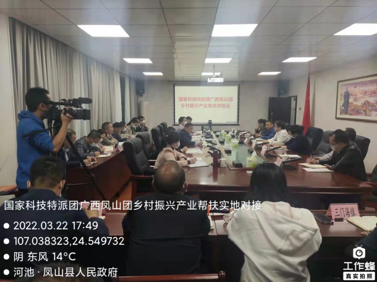 县委书记薛海源主持对接会,县长杨胜涛出席会议并介绍了凤山县特色产业工作情况,凤山境内林产资源丰富,全县现有杉木43万亩、油茶35万亩、八角22万亩和核桃33.96万亩,是广西主要的八角产区和木材生产基地之一。但科学化标准化种植技术、病虫害防治技术、精深加工技术仍然存在短板,中央向乡村振兴重点帮扶县选派科技特派团的专家、教授支援凤山县农林产业发展恰逢其时,为凤山县农林产业快速发展注入了科技动力,相信在科技特派团指导下,能够进一步推动凤山县农林产业高质量发展。