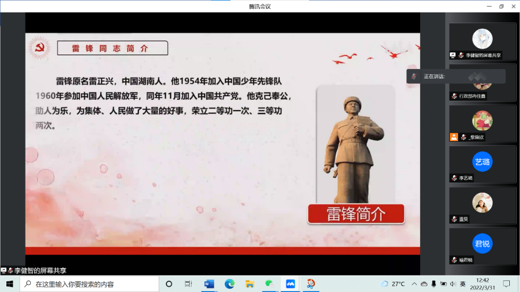 为进一步学习贯彻落实“雷锋精神”,积极引导广大团员青年向雷锋学习,树立奉献、友爱、互助、进步的时代新风。2022年3月31日,食品学院2021-2022期青马班、学“习”社全体成员参与“雷锋精神”微团课学习暨青马班、学“习”社主题微团课视频录制专题讨论的活动。
