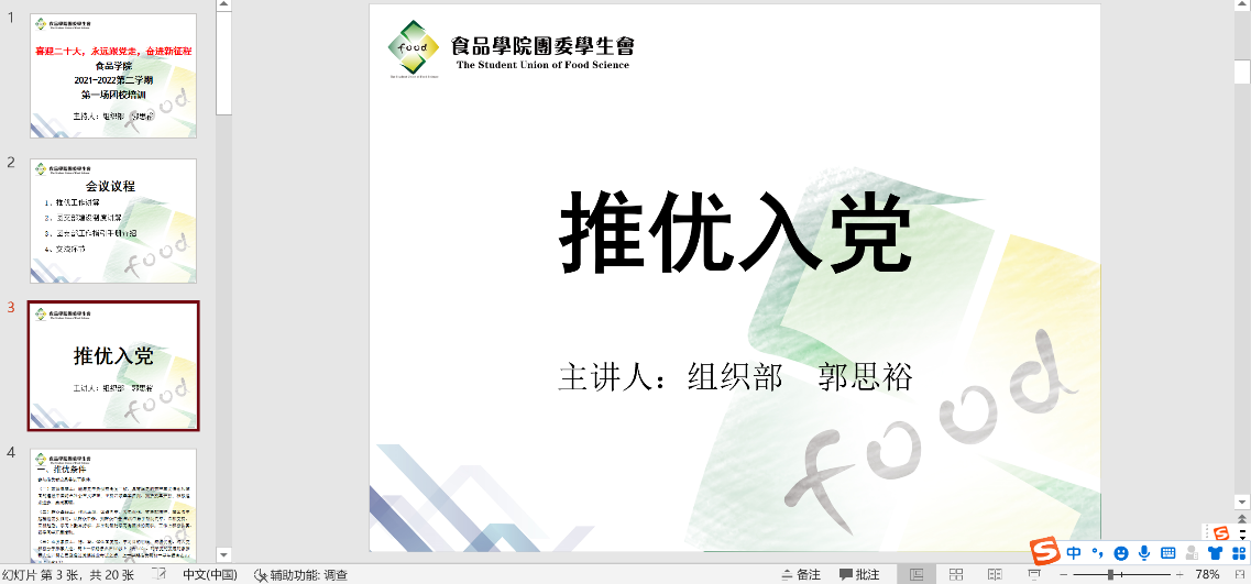 培训会过程中,郭思裕同学为团支书开展了有关推优入党的工作的讲解,介绍了推优条件、推优所需材料还有其他有关注意事项,着重强调了推优流程的规范。