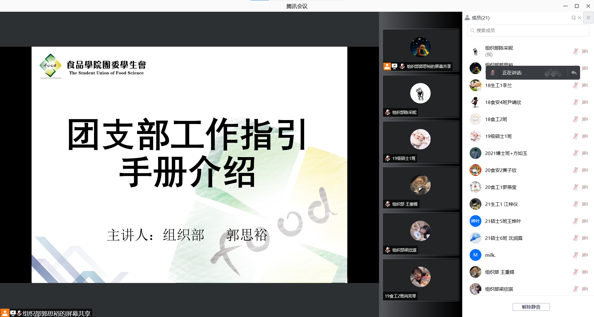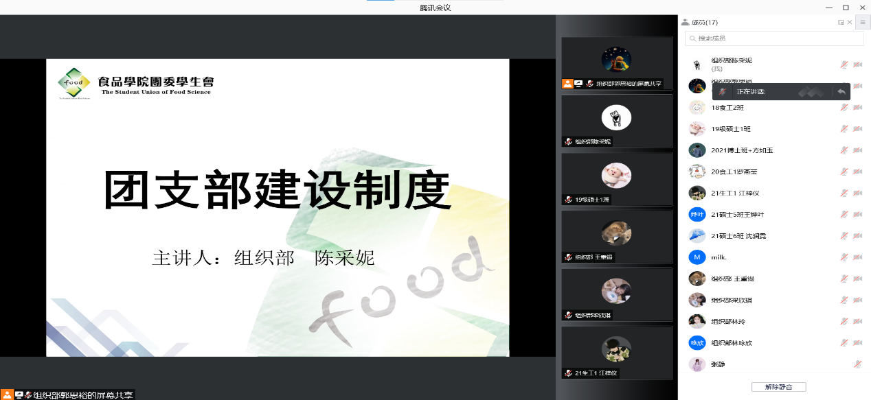 2022年3月27日星期日晚上,本学期第一次团校培训在腾讯会议线上顺利召开,本次培训由组织部郭思裕主持,团委书记王曾惠老师、党信党务部周子楹同学出席会议,食品学院全体团支书和学院团委组织部全体干部及干事参加会议。
