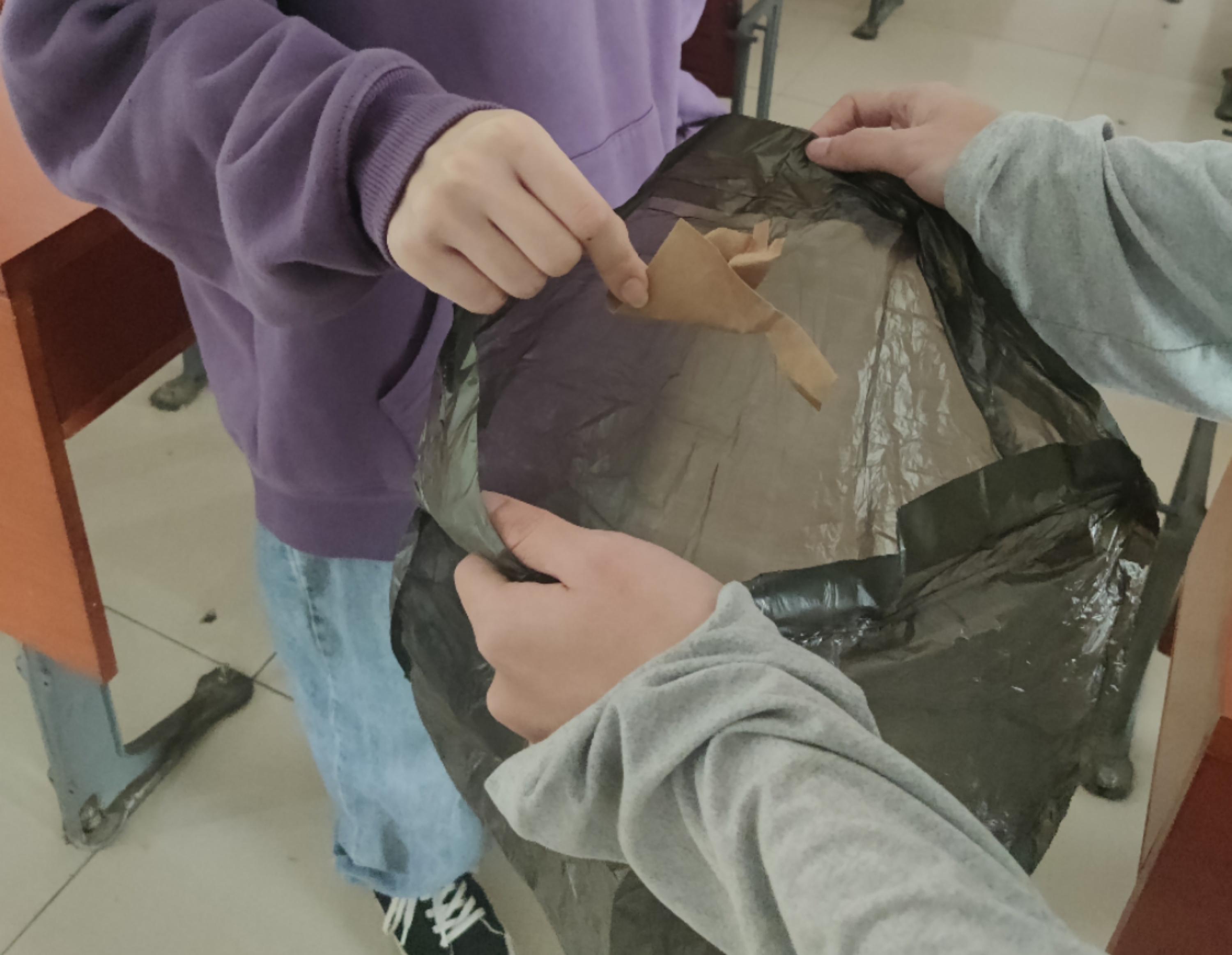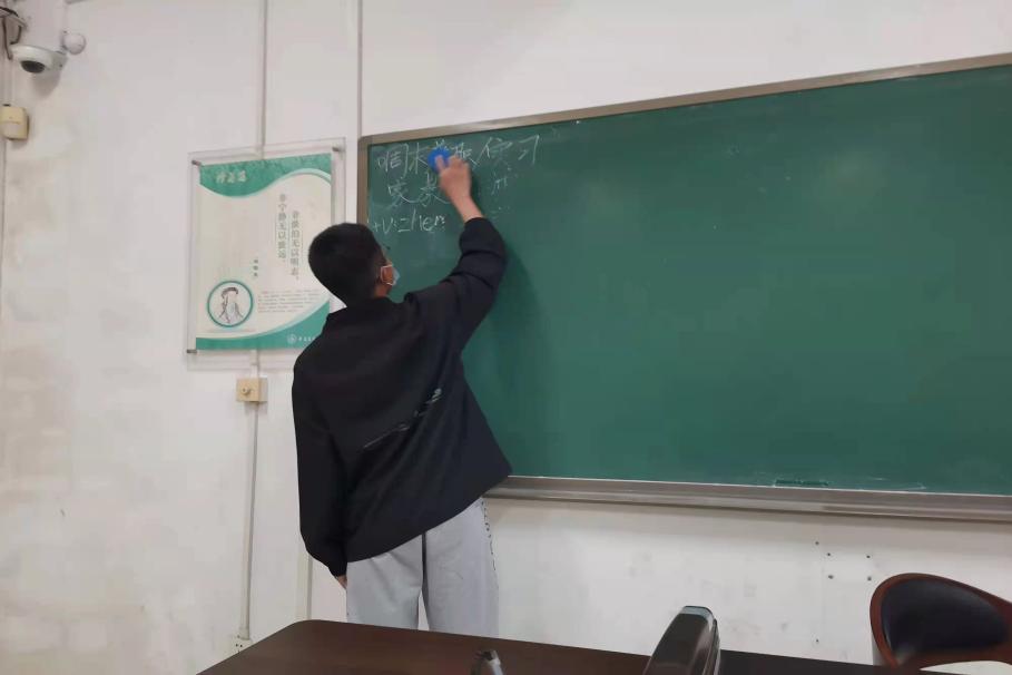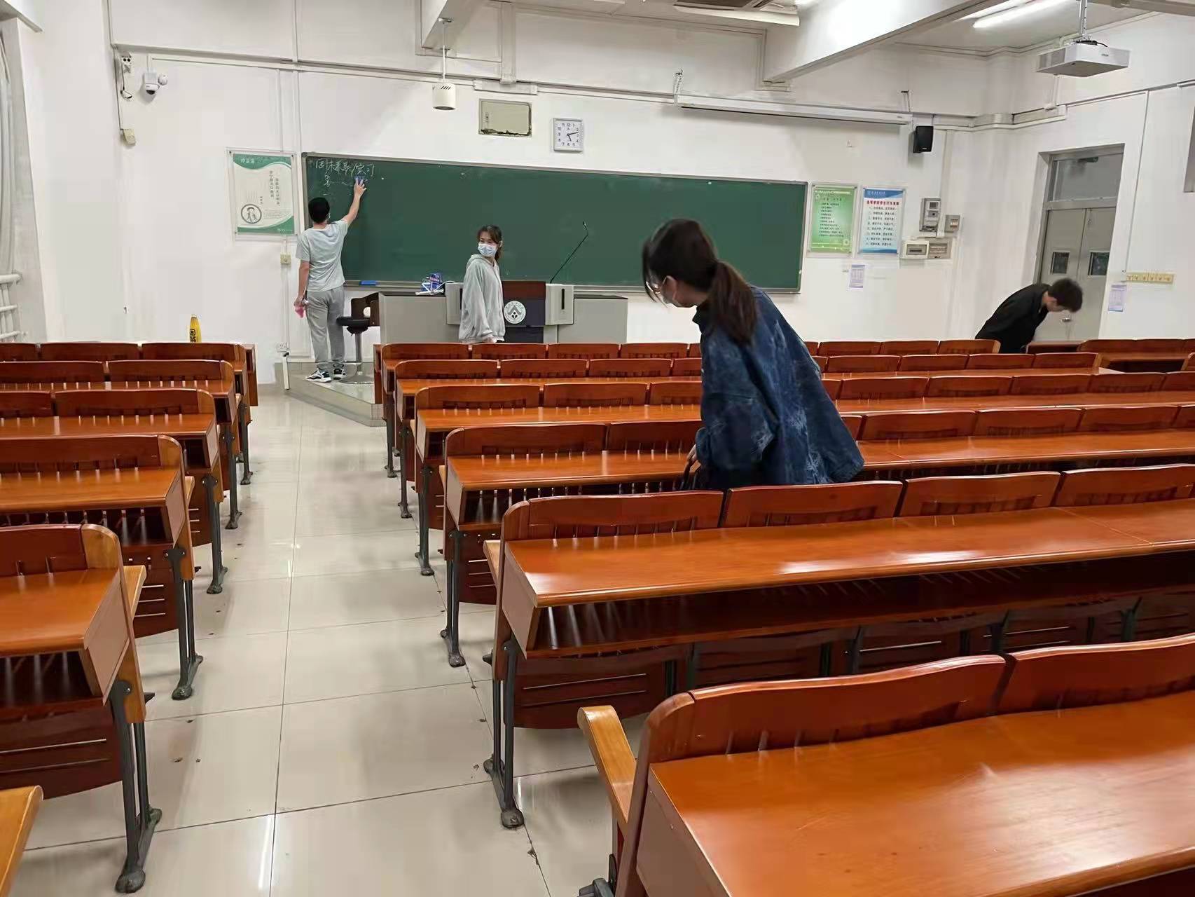 自强小组的志愿者们穿行在第五教学楼中,仔细清理了教室内地面上和座位柜筒内遗留的一些垃圾,包括早餐包装盒、塑料袋、纸巾等。