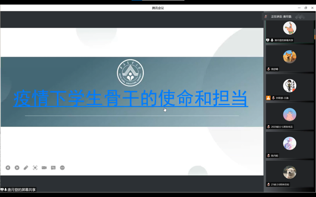 第一部分中,研究生骨干们先认真观看了一个微视频,视频标题为《无奋斗不青春,疫情中青年人的理想与担当》。视频中广大青年们在疫情来临时,积极投身战“疫”一线,坚持奋战工作岗位,始终不惧风险挑战,这样的青春姿态让我们看到新时代青年展现出的无私与奉献、勇气与担当、初心与使命。