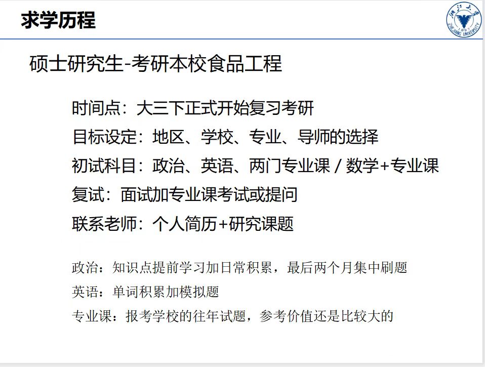校友张佳本科就读于华南农业大学生物专业,目前是博士研究生一年级,就读于浙江大学能源工程学院。她首先简单介绍了她的求学历程,帮助同学们大致了解考研读博的历程。之后她就读研日常生活、如何确定研究方向、如何缓解读研压力等三方面分享了她自己的经历和看法。关于读研压力是不是很大的问题,她认为只要有计划,避免拖延,同时调整心态,降低预期,就可以一定程度上缓解读研期间的心理压力。