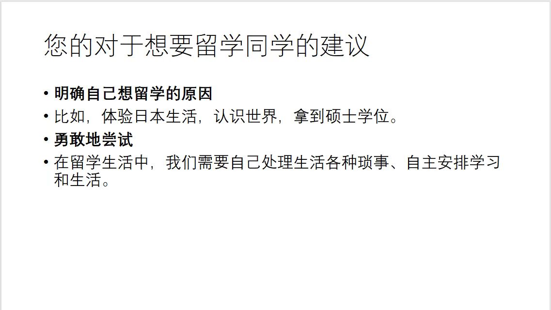 校友吴宇筝同样是2018届食工专业毕业生,硕士研究生就读于日本神户大学,现博士研究生在读一年级。她首先针对从什么时候开始准备留学、准备什么、如何申请留学资格等方面简单介绍了她的求学历程,帮助同学们大致了解国外留学深造的历程。之后她就如何确定研究方向、国内外学习氛围差异、对想要留学的同学的建议等方面分享了她自己的看法。关于如何确定自己的研究方向,她建议同学们先在各大学官网查阅,了解具体方向有哪些,再综合课题相关的研究室情况和查阅论文来选择自己的研究主题。