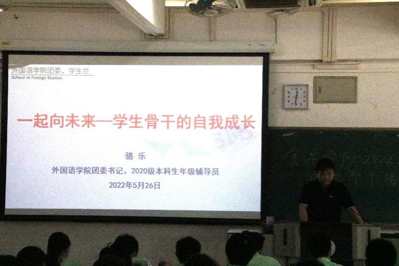 为进一步加强我院团学组织建设,提高我院团学骨干的思想政治意识和业务水平,我院团委于5月26日中午在第五教学楼5C203开展了以《一起向未来——学生骨干的自我成长》为主题的2022年春季团学骨干培训。本次会议邀请了外国语学院团委书记骆乐老师做主讲,食品学院团委学生会组织工作人员、基层团支部支委代表参加会议。