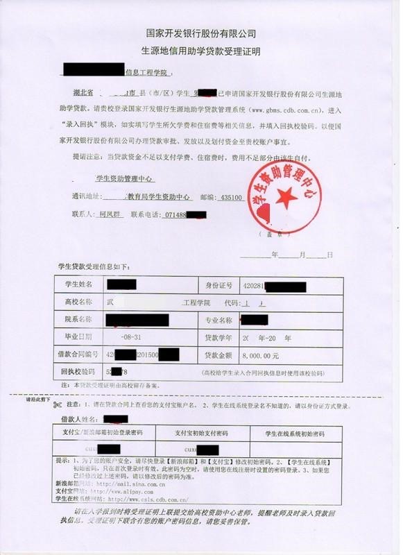 4.回执录入。贷款合同签订后,县级资助中心将向学生出具《国家开发银行生源地信用助学贷款受理证明》(有的以短信形式发送回执验证信息)。学生在9月回高校注册报到时按要求上交《受理证明》或上报回执验证信息,高校核对信息,并于10月10日前完成回执录入工作,学生贷款正式生效。