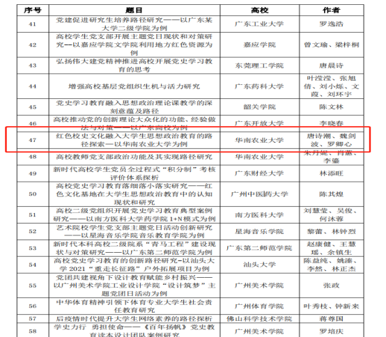 近日,广东省高校党建研究会公布2021年年会论文获奖名单,在学校党委的支持下,我院文章《红色校史文化融入大学生思想政治教育的路径探索—以华南农业大学为例》,在2021年广东省高等学校党的建设研究会年会论文征集评比中荣获三等奖。