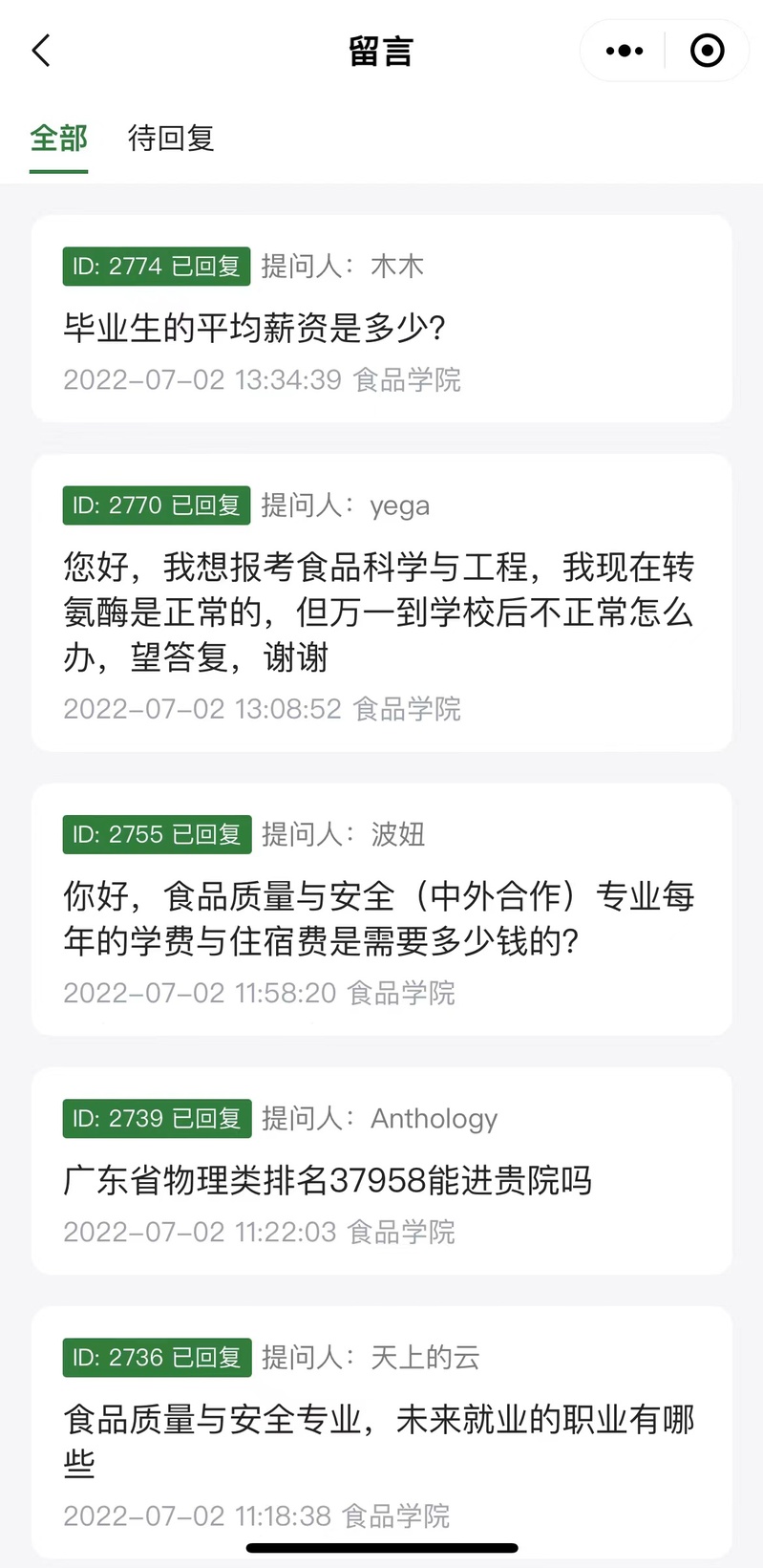 我院在高考前就建立了2022年广州市华农招生咨询QQ群及目标生源中学的微信群,及时转发、推送学校重点、亮点和特色活动信息。在志愿填报的关键期,组织辅导员、学生志愿者及各生源中学招生宣传大使全天候排班接听招生咨询电话,及时回复本科招生小程序及咨询群内考生及家长的相关疑问,耐心细致的解答得到了考生及家长的一致肯定。