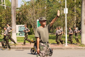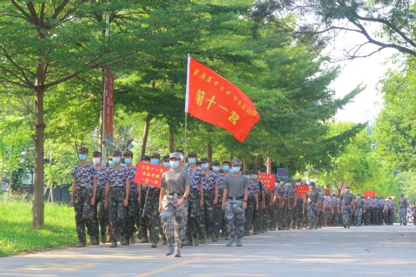 以响亮的口号作为启程的军号,食品兵们昂首阔步地开启了本次的徒步行军。十一营的营旗随着坚定的步伐迎风而起,在阳光的照耀下更显行军队伍的气势不凡。食品兵们步伐整齐,踏过坡路、穿过林荫,用脚步丈量每寸紫荆土地,让嘹亮军歌响遍每处校园角落。