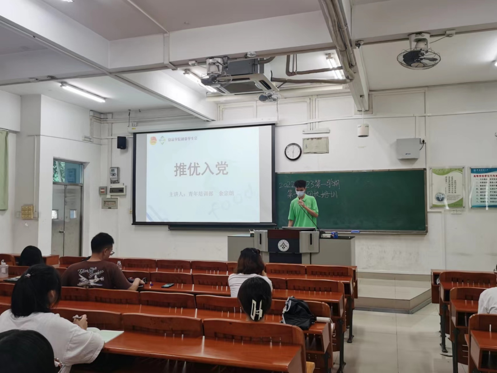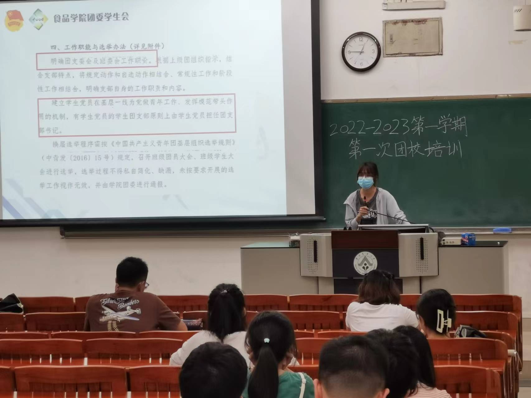 2022年9月21日星期三,本学期团支书例会暨第一次团校培训在教五C202室顺利召开,本次培训由青年培训部余宗朗主持,团委副书记麦基好同学出席会议,食品学院全体团支书和学院团委青年培训部干部参加会议。