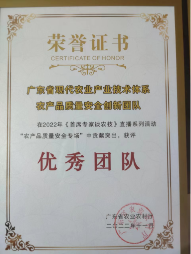 近日,广东省现代农业产业体系农产品质量安全共性关键技术创新团队首席专家、我院院长雷红涛教授带领团队参加了由广东省农业农村厅主办,广东省农学会和广州国家现代农业产业科技创新中心承办的《首席专家谈农技》“农产品质量安全”专场直播活动(https://m.itouchtv.cn/liveOb/83949?shareId=aS%21LXLZB),以“如何做好舌尖上的安全”为主题,展开讲解、讨论、互动,收看人次达11.2万,取得了良好科普效果,获评“优秀团队”。