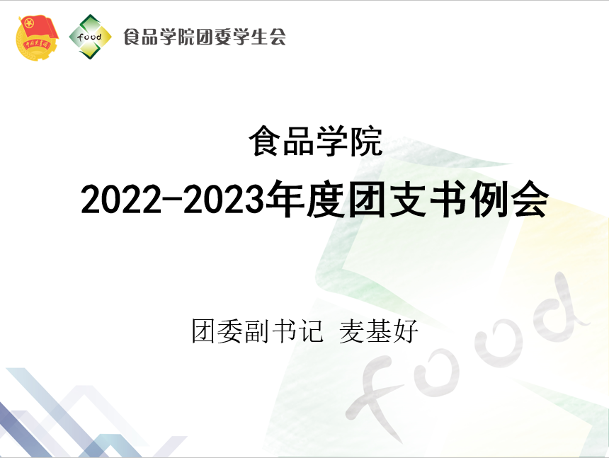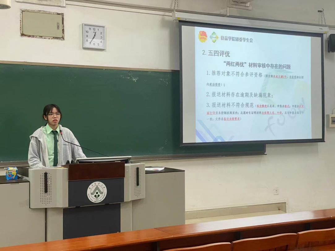 为更好开展2022-2023年度校院两级五四评优工作,食品学院团委于2023年3月30日中午成功召开团支书例会,院团委副书记麦基好、团委部分工作人员及食品学院全体本科生团支书出席会议。