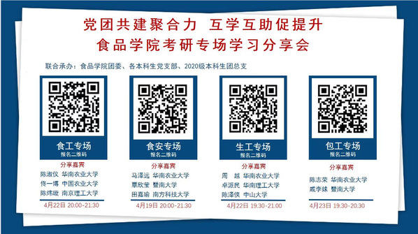 本次活动以专业为单位开设了食品质量与安全、食品科学与工程、生物工程、包装工程四个专场,共邀请了11位2019级成功考取研究生的中国共产党员、团员学生代表进行分享,以朋辈的角度为具有考研打算的师弟师妹提供考研复习经验、解答困惑。