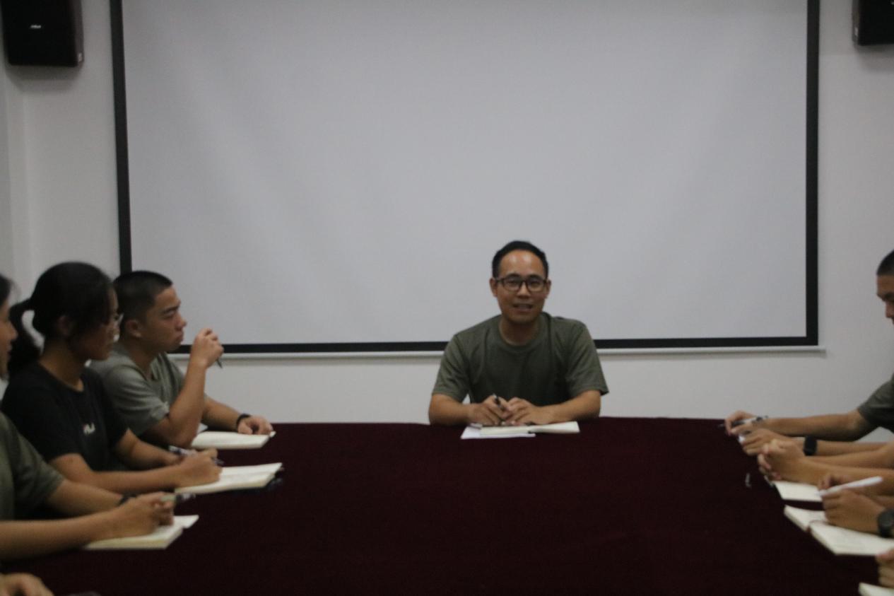 教导员余聪老师提出本次军训对教官们的期望,余老师指出,食品中队一直是一个优秀的集体,希望全体教官能够继承前辈光荣传统,不忘初心,在带训的同时帮助学员适应和融入大学生活。他强调,军训不仅仅是军事技能的训练,教官们更要注重对学员爱党爱国爱校意识的培养,要积极向学员们宣传丁颖精神,卢永根院士的先进事迹。此外,余老师鼓励教官们要互相沟通、互相学习,根据学员的不同特点进行因材施教,科学带训、安全带训。