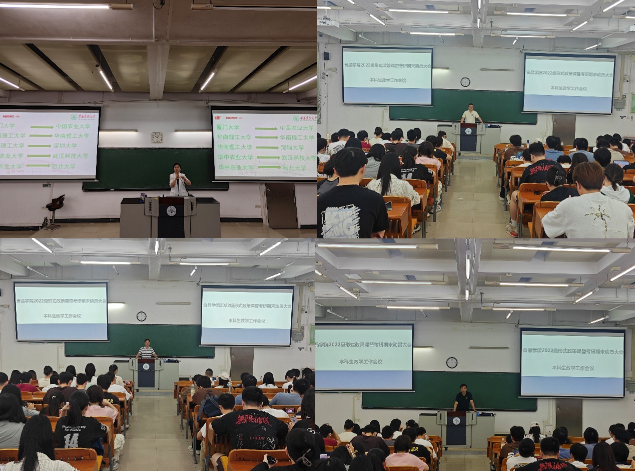 为进一步做好学院2022级本科生考研及就业服务,4月17日与5月16日,学院在第三教学楼分别举行两场考研期末动员大会,学院党委副书记徐聪聪、生物工程系主任陈忠正、食品工程系主任黎攀、食品科学系副主任宋明月、2021级辅导员宋政以及部分考研上岸代表出席,大会由辅导员陈巍主持。