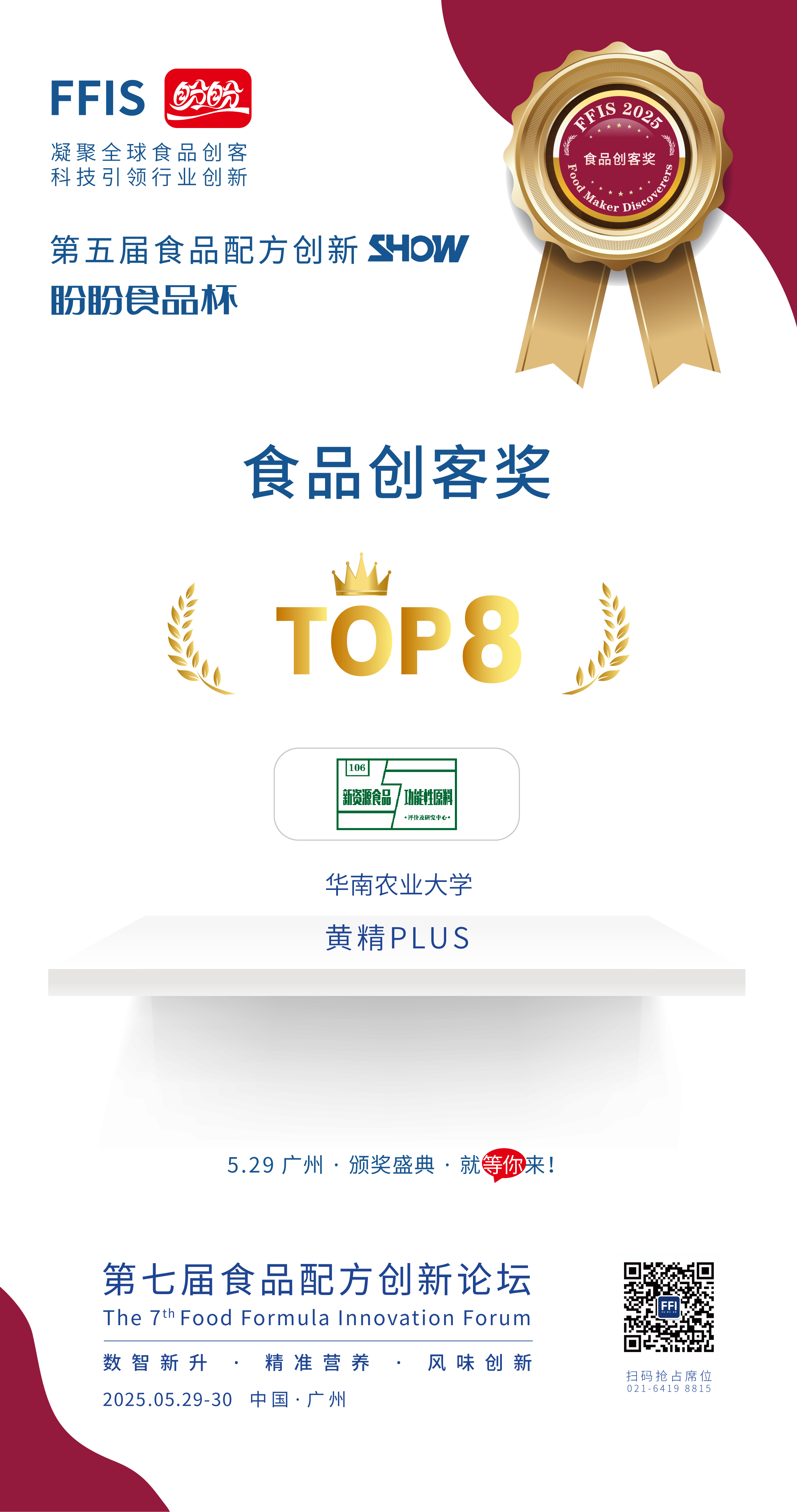 近日,在食品行业备受瞩目的第五届食品配方创新SHOW(FFIS)上,我院国家中药材产业技术体系岗位科学家杜冰教授带领新资源食品与功能性原料评价及研究中心学生团队,凭借创新产品“黄精PLUS”荣获“食品创客奖TOP8”荣誉。这一奖项是非成品组最高荣誉,充分彰显了我校在食品科技创新及人才培养方面的强劲实力。